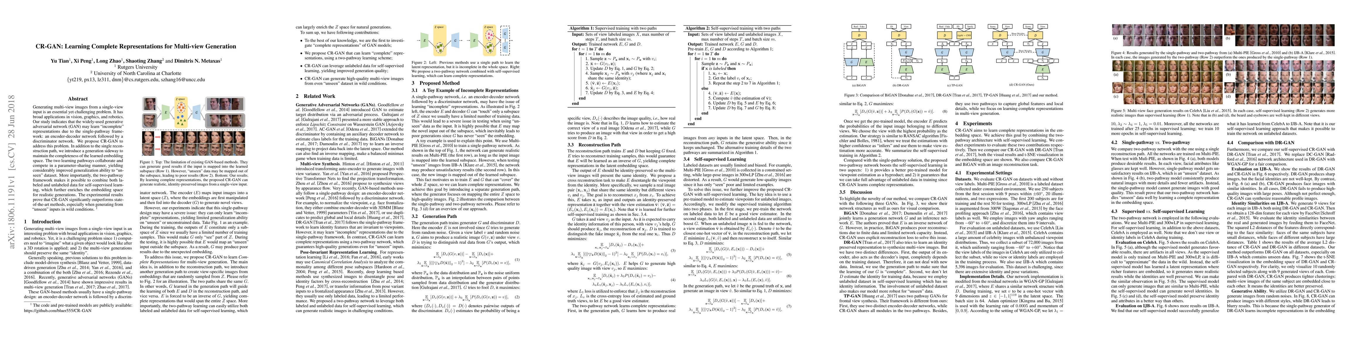 Generating multi-view images from a single-view input is an essential yet challenging problem. It has broad applications in vision, graphics, and robotics. Our study indicates that the widely-used generative adversarial network (GAN) may learn "incomplete" representations due to the single-pathway framework: an encoder-decoder network followed by a discriminator network. We propose CR-GAN to address this problem. In addition to the single reconstruction path, we introduce a generation sideway to maintain the completeness of the learned embedding space. The two learning pathways collaborate and compete in a parameter-sharing manner, yielding considerably improved generalization ability to "unseen" dataset. More importantly, the two-pathway framework makes it possible to combine both labeled and unlabeled data for self-supervised learning, which further enriches the embedding space for realistic generations. The experimental results prove that CR-GAN significantly outperforms state-of-the-art methods, especially when generating from "unseen" inputs in wild conditions.