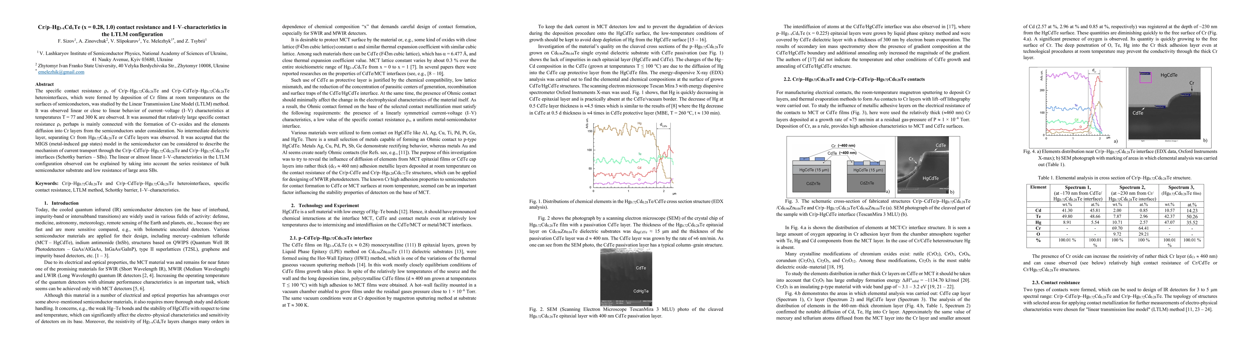 The study investigates the contact resistance of Cr on p-type Hg$_{0.72}$Cd$_{0.28}$Te and Cr/p-CdTe/p-Hg$_{0.72}$Cd$_{0.28}$Te heterointerfaces using the LTLM method, finding linear I-V characteristics and attributing high $\rho_c$ to Cr-oxides formation and element diffusion, without evidence of an intermediate dielectric layer.