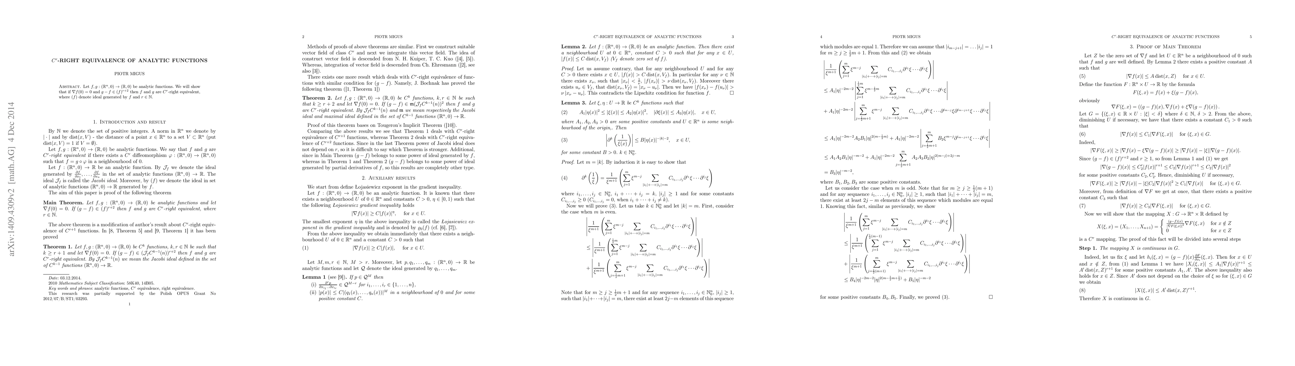 Let $f,g:(\mathbb{R}^n,0)\rightarrow (\mathbb{R},0)$ be analytic functions. We will show that if $\nabla f(0)=0$ and $g-f \in (f)^{r+2}$ then $f$ and $g$ are $C^r$-right equivalent, where $(f)$ denote ideal generated by $f$ and $r\in \mathbb{N}$.