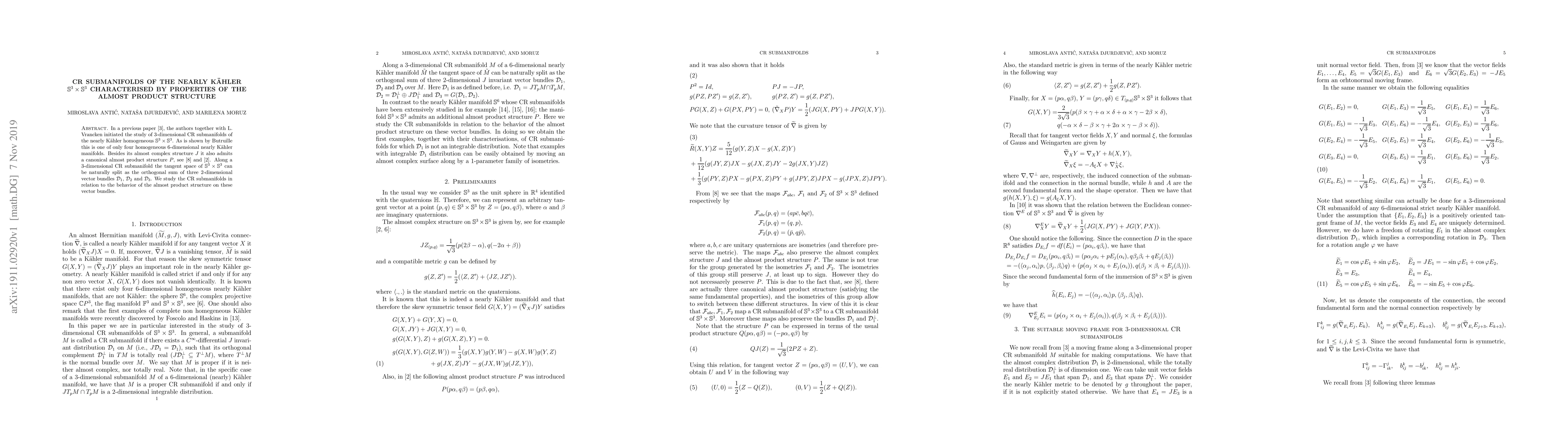 This paper investigates 3-dimensional CR submanifolds within the nearly Kähler homogeneous space \( \mathbb S^3 \times \mathbb S^3 \), focusing on the influence of the almost product structure \( P \) on the vector bundles \( \mathcal D_1 \), \( \mathcal D_2 \), and \( \mathcal D_3 \) that form the tangent space's orthogonal decomposition.