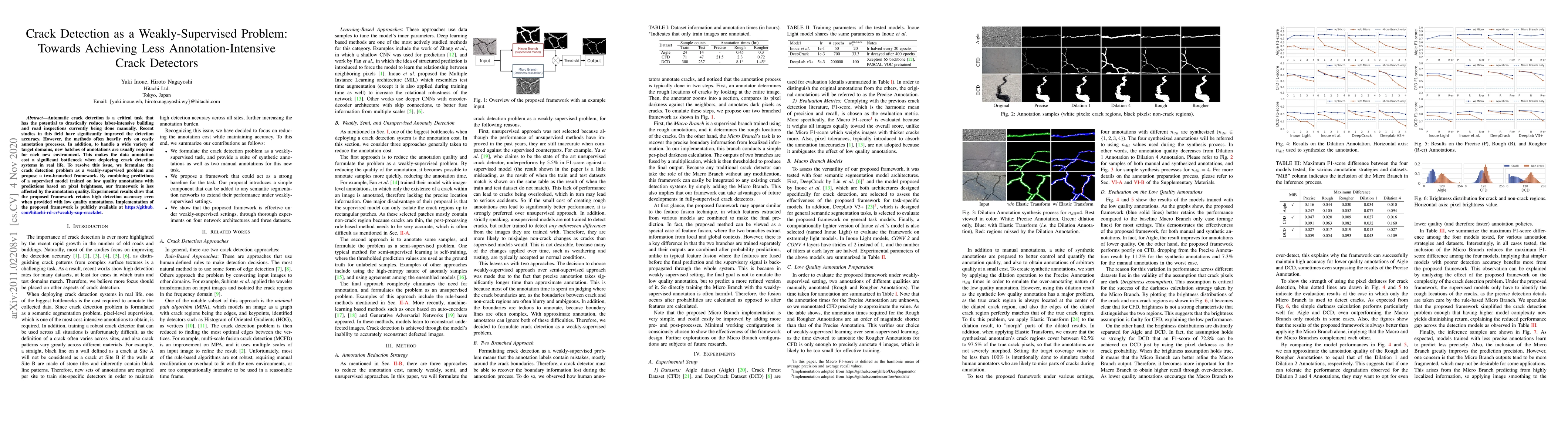 This paper proposes a weakly-supervised framework for crack detection that reduces reliance on costly, high-quality annotations, achieving high detection accuracy with low-quality annotations and pixel brightness information. The framework's effectiveness is demonstrated through experiments, and the implementation is available publicly.