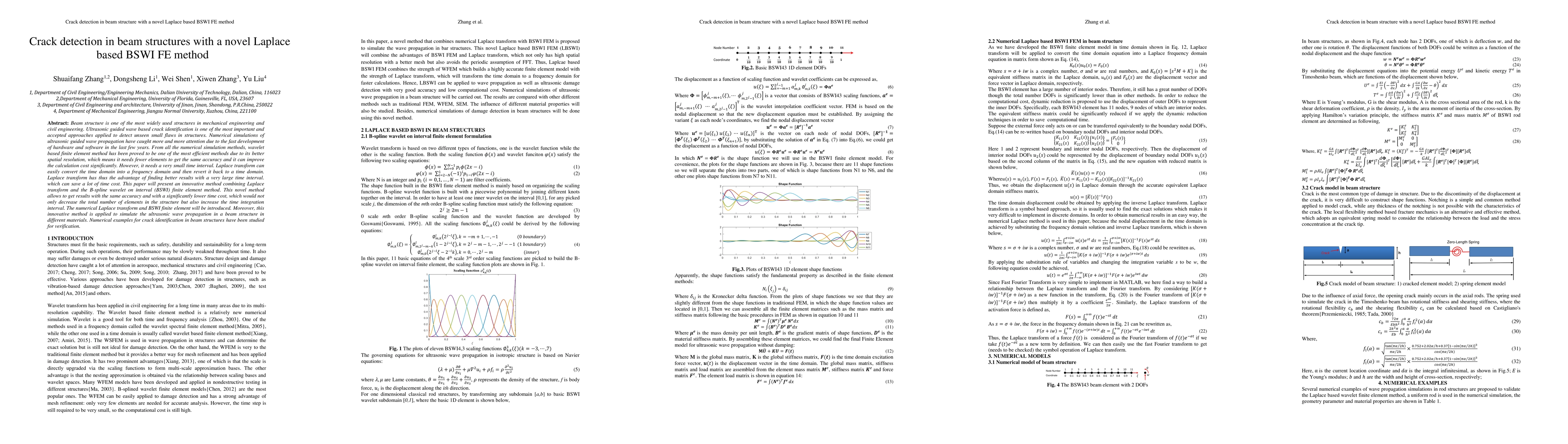 Beam structure is one of the most widely used structures in mechanical engineering and civil engineering. Ultrasonic guided wave based crack identification is one of the most important and accepted approaches applied to detect unseen small flaws in structures. Numerical simulations of ultrasonic guided wave propagation have caught more and more attention due to the fast development of hardware and software in the last few years. From all the numerical simulation methods, wavelet based finite element method has been proved to be one of the most efficient methods due to its better spatial resolution, which means it needs fewer elements to get the same accuracy and it can improve the calculation cost significantly. However, it needs a very small time interval. Laplace transform can easily convert the time domain into a frequency domain and then revert it back to a time domain. Laplace transform has thus the advantage of finding better results with a very large time interval. which can save a lot of time cost. This paper will present an innovative method combining Laplace transform and the B-spline wavelet on interval (BSWI) finite element method. This novel method allows to get results with the same accuracy and with a significantly lower time cost, which would not only decrease the total number of elements in the structure but also increase the time integration interval. The numerical Laplace transform and BSWI finite element will be introduced. Moreover, this innovative method is applied to simulate the ultrasonic wave propagation in a beam structure in different materials. Numerical examples for crack identification in beam structures have been studied for verification.