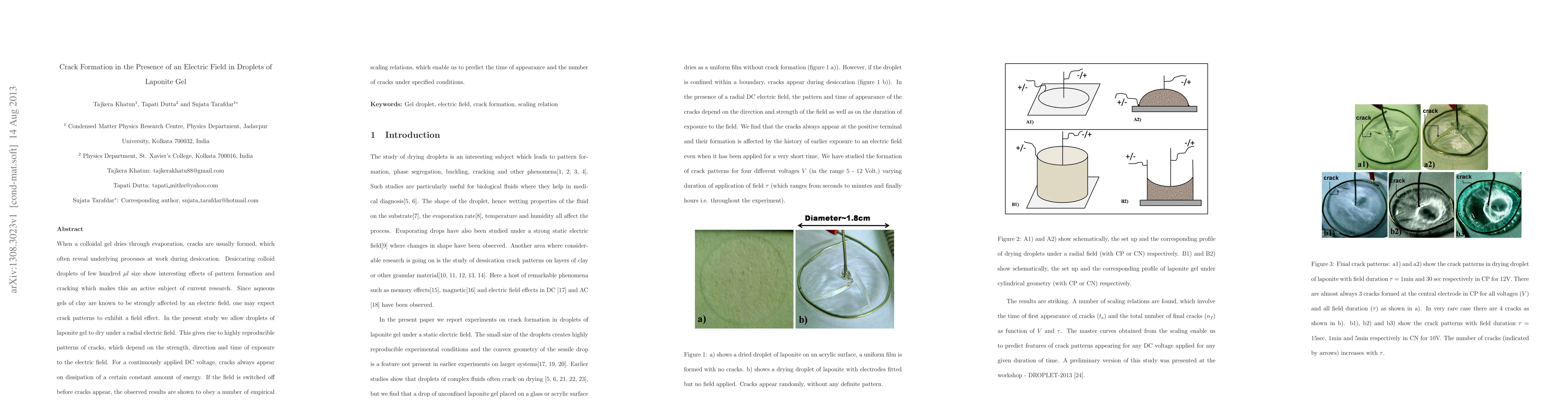 This study investigates the formation of cracks in drying laponite gel droplets under a radial electric field, revealing reproducible crack patterns influenced by field strength, direction, and exposure time. The research demonstrates that cracks appear consistently after a certain energy dissipation, and empirical scaling relations can predict crack appearance and number based on these conditions.