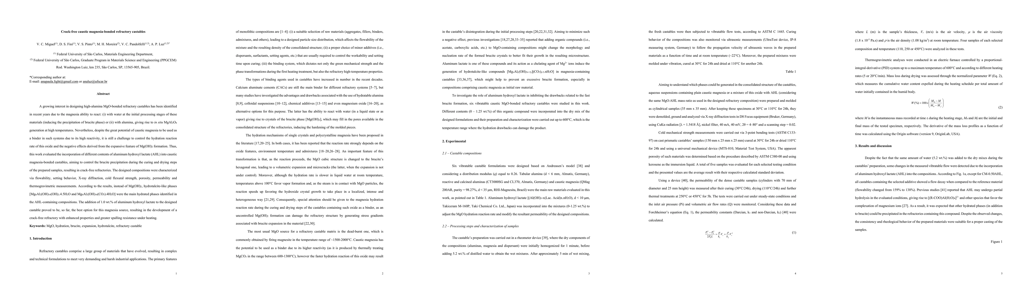A growing interest in designing high-alumina MgO-bonded refractory castables has been identified in recent years due to the magnesia ability to react: (i) with water at the initial processing stages of these materials (inducing the precipitation of brucite phase) or (ii) with alumina, giving rise to in situ MgAl2O4 generation at high temperatures. Nevertheless, despite the great potential of caustic magnesia to be used as a binder in such systems due to its high reactivity, it is still a challenge to control the hydration reaction rate of this oxide and the negative effects derived from the expansive feature of Mg(OH)2 formation. Thus, this work evaluated the incorporation of different contents of aluminum hydroxyl lactate (AHL) into caustic magnesia-bonded castables, aiming to control the brucite precipitation during the curing and drying steps of the prepared samples, resulting in crack-free refractories. The designed compositions were characterized via flowability, setting behavior, X-ray diffraction, cold flexural strength, porosity, permeability and thermogravimetric measurements. According to the results, instead of Mg(OH)2, hydrotalcite-like phases [Mg6Al2(OH)16(OH)2.4.5H2O and Mg6Al2(OH)16(CO3).4H2O] were the main hydrated phases identified in the AHL-containing compositions. The addition of 1.0 wt.% of aluminum hydroxyl lactate to the designed castable proved to be, so far, the best option for this magnesia source, resulting in the development of a crack-free refractory with enhanced properties and greater spalling resistance under heating.