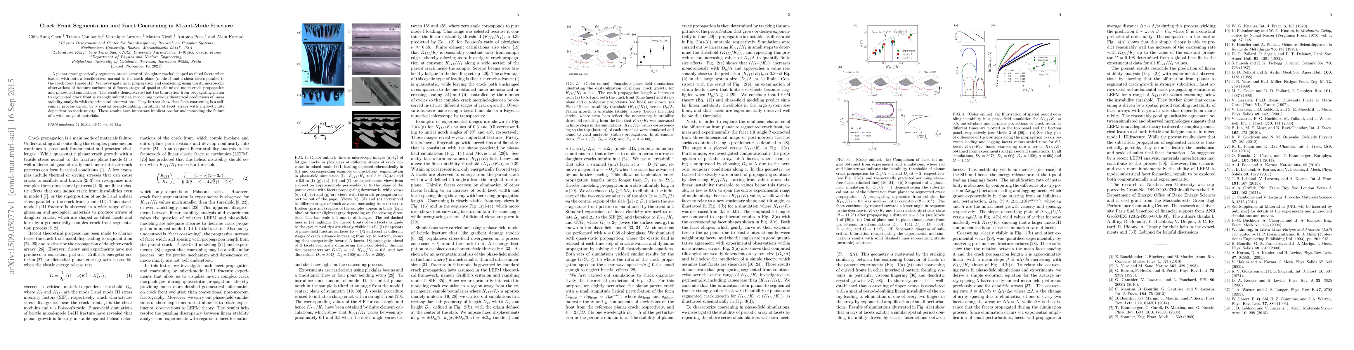 This paper investigates the segmentation and coarsening of crack facets in mixed-mode fracture through in-situ microscopy and simulations. It finds that the transition from planar to segmented crack front is strongly subcritical and that facet coarsening is driven by a self-similar, period-doubling instability.