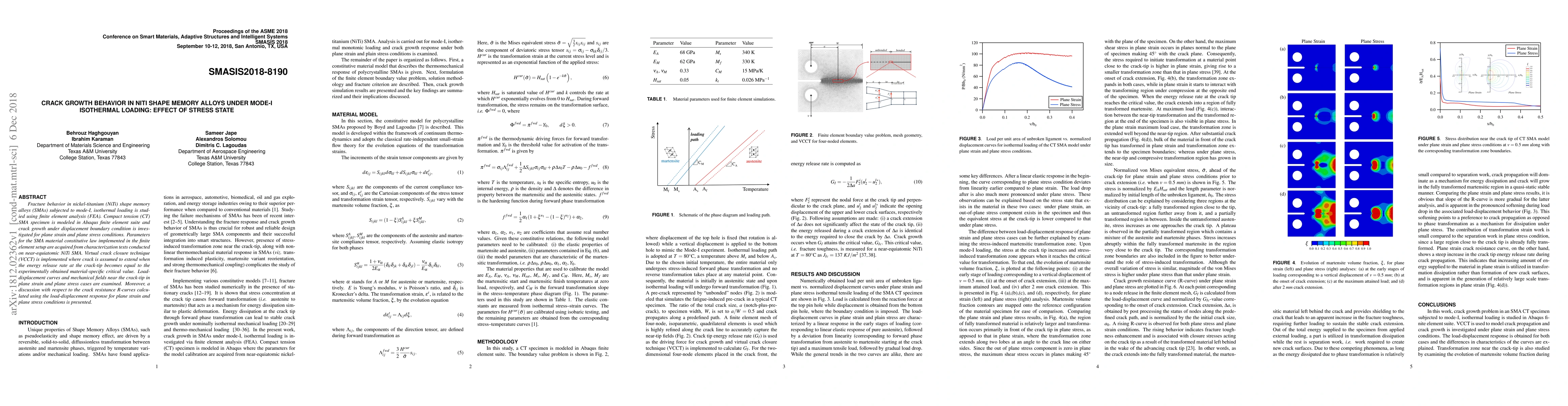 This paper investigates the fracture behavior of NiTi shape memory alloys under mode-I isothermal loading using finite element analysis. It examines crack growth in compact tension specimens under plane strain and plane stress conditions, discussing the effect of stress state on crack resistance R-curves.