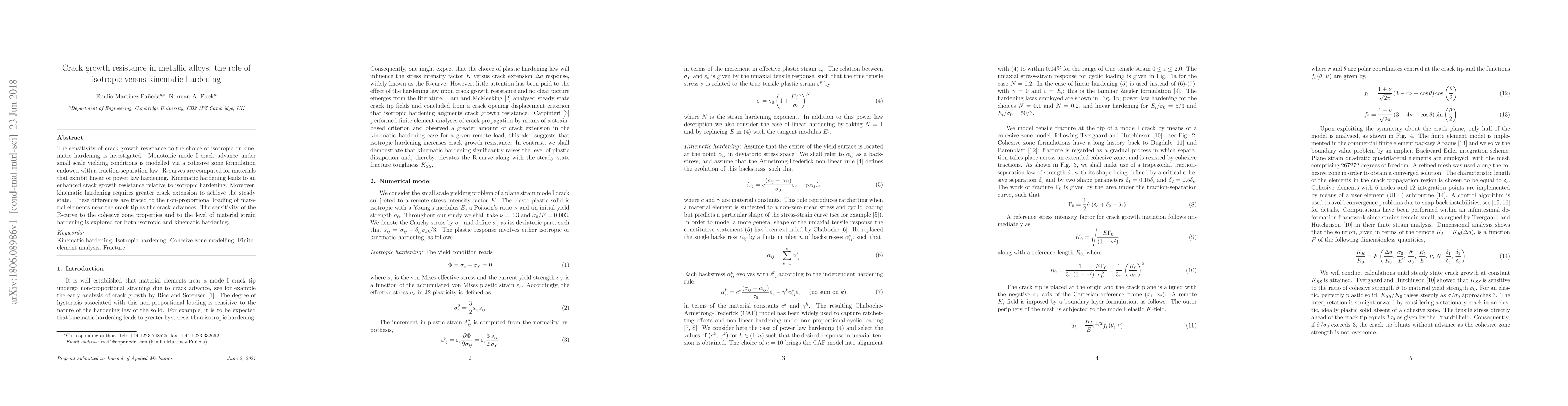 This paper investigates the impact of isotropic versus kinematic hardening on crack growth resistance in metallic alloys, finding that kinematic hardening enhances resistance and requires more crack extension to reach steady state due to non-proportional loading near the crack tip. The study also explores how R-curves vary with cohesive zone properties and material strain hardening.