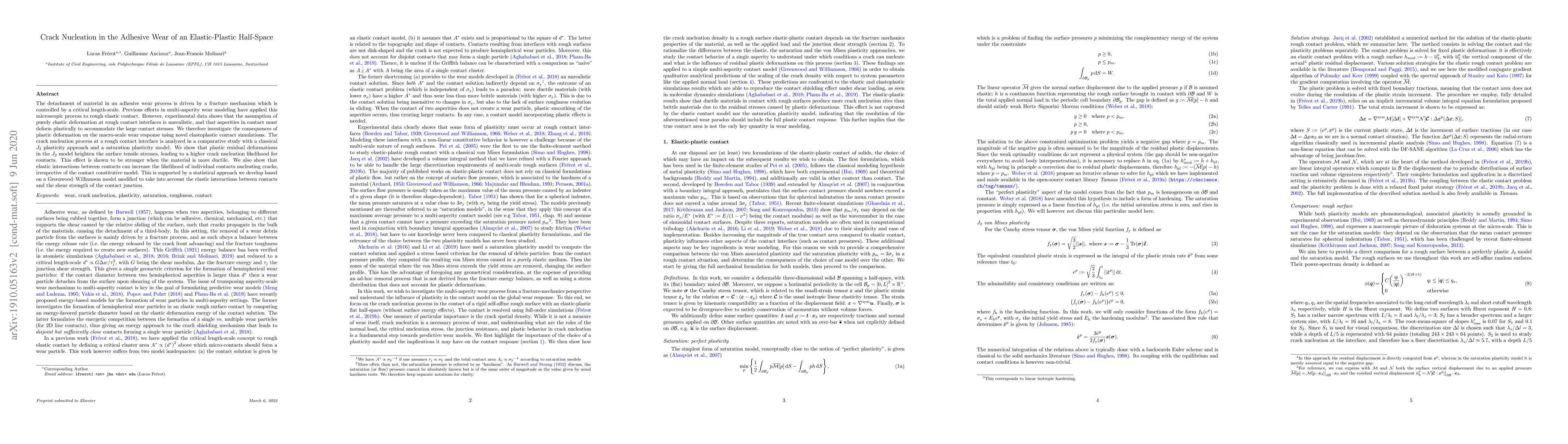 The detachment of material in an adhesive wear process is driven by a fracture mechanism which is controlled by a critical length-scale. Previous efforts in multi-asperity wear modeling have applied this microscopic process to rough elastic contact. However, experimental data shows that the assumption of purely elastic deformation at rough contact interfaces is unrealistic, and that asperities in contact must deform plastically to accommodate the large contact stresses. We therefore investigate the consequences of plastic deformation on the macro-scale wear response using novel elastoplastic contact simulations. The crack nucleation process at a rough contact interface is analyzed in a comparative study with a classical $J_2$ plasticity approach and a saturation plasticity model. We show that plastic residual deformations in the $J_2$ model heighten the surface tensile stresses, leading to a higher crack nucleation likelihood for contacts. This effect is shown to be stronger when the material is more ductile. We also show that elastic interactions between contacts can increase the likelihood of individual contacts nucleating cracks, irrespective of the contact constitutive model. This is supported by a statistical approach we develop based on a Greenwood--Williamson model modified to take into account the elastic interactions between contacts and the shear strength of the contact junction.