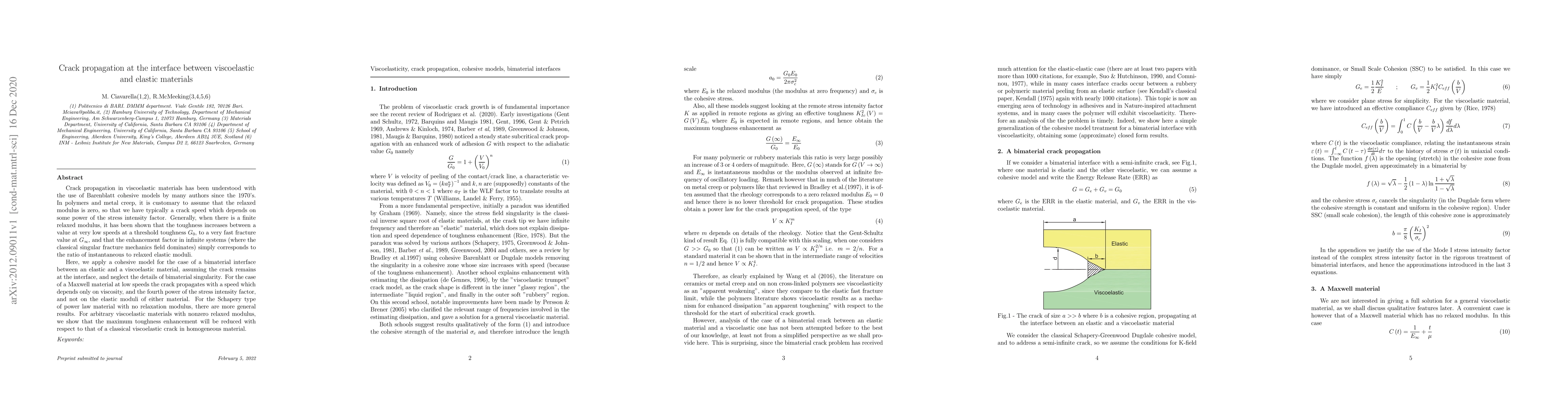 This paper investigates crack propagation at the interface between viscoelastic and elastic materials using a cohesive model. It finds that at low speeds, the crack speed depends on viscosity and the fourth power of the stress intensity factor, independent of elastic moduli. For viscoelastic materials with a nonzero relaxed modulus, the maximum toughness enhancement is lower than in homogeneous viscoelastic materials.