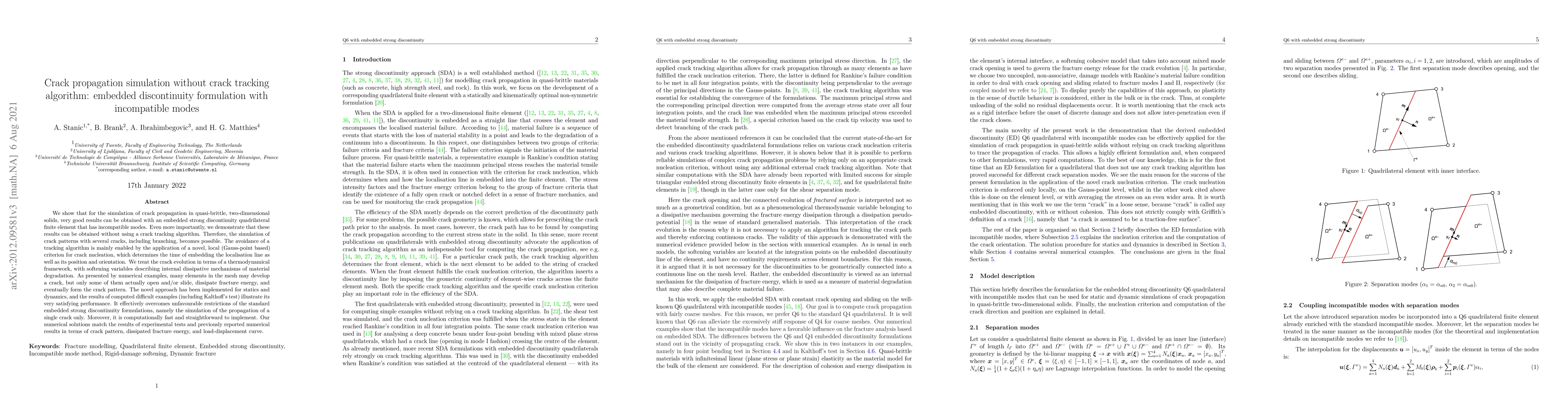 This research introduces a novel method for simulating crack propagation in quasi-brittle materials using an embedded finite element with incompatible modes, eliminating the need for a crack tracking algorithm. The approach uses a local Gauss-point criterion for crack nucleation and a thermodynamic framework with softening variables. The results match experimental data and previous numerical results, offering a computationally efficient and versatile solution for complex crack patterns.