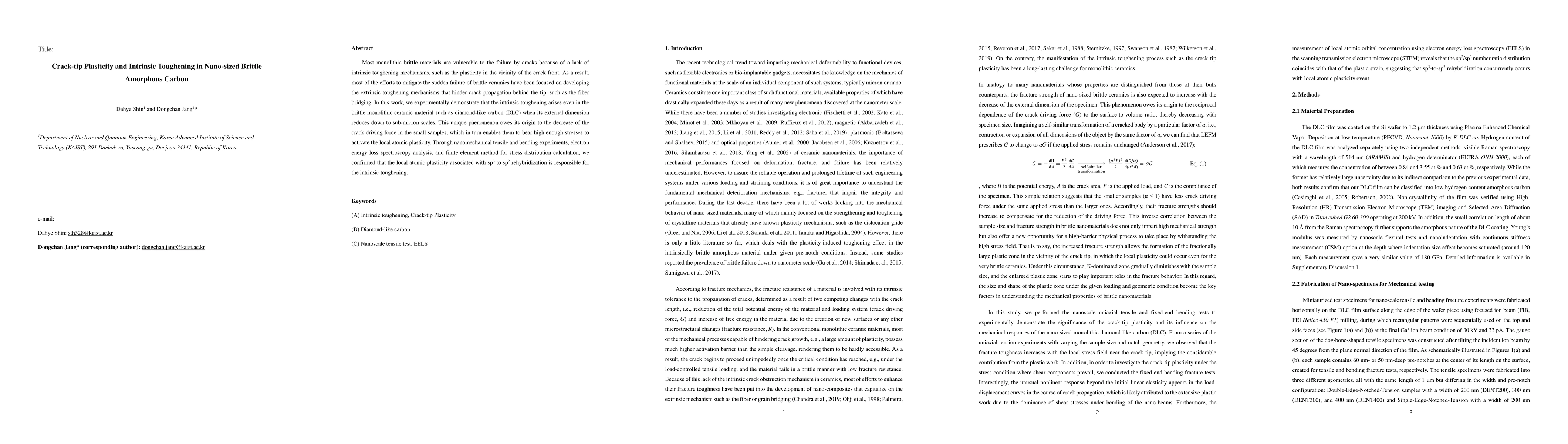 This research demonstrates that intrinsic toughening mechanisms, such as local atomic plasticity, can emerge in nano-sized brittle amorphous carbon due to the reduced crack driving force, enabling stress levels sufficient to activate sp3 to sp2 rehybridization. This intrinsic toughening contrasts with traditional extrinsic mechanisms and offers new insights for enhancing the toughness of brittle materials at the nanoscale.