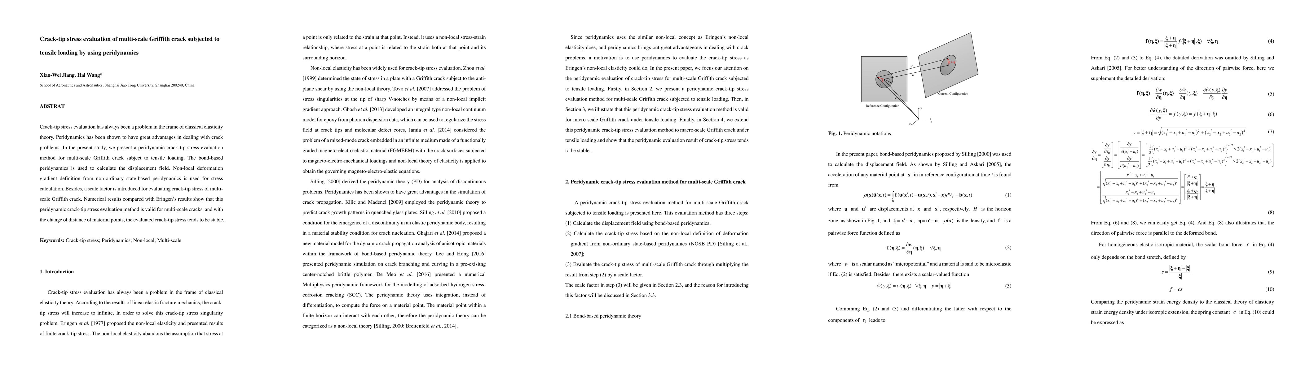 This paper proposes a peridynamic method for evaluating crack-tip stress in multi-scale Griffith cracks under tensile loading, using bond-based peridynamics for displacement and non-ordinary state-based peridynamics for stress calculation. Numerical results validate the method's effectiveness and stability in assessing crack-tip stress.