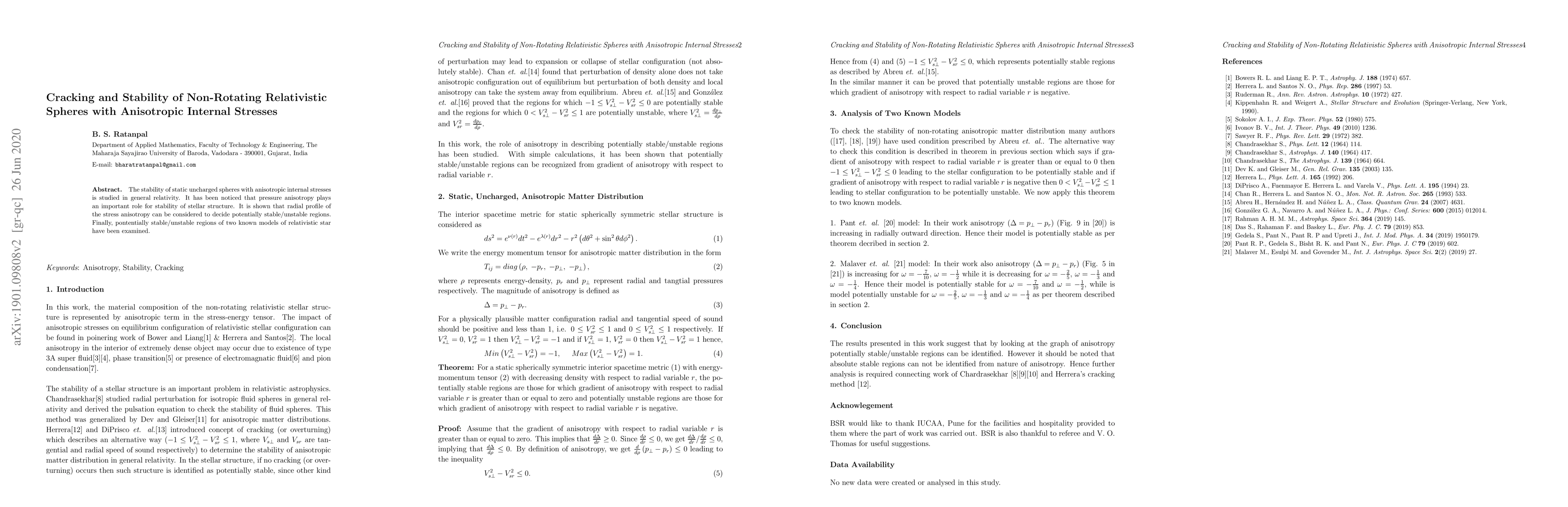 This paper investigates the stability of non-rotating relativistic spheres in general relativity under anisotropic internal stresses, emphasizing the role of pressure anisotropy in stellar structure. It identifies regions of potential stability or instability based on the radial profile of stress anisotropy, and examines these regions in two known models of relativistic stars.
