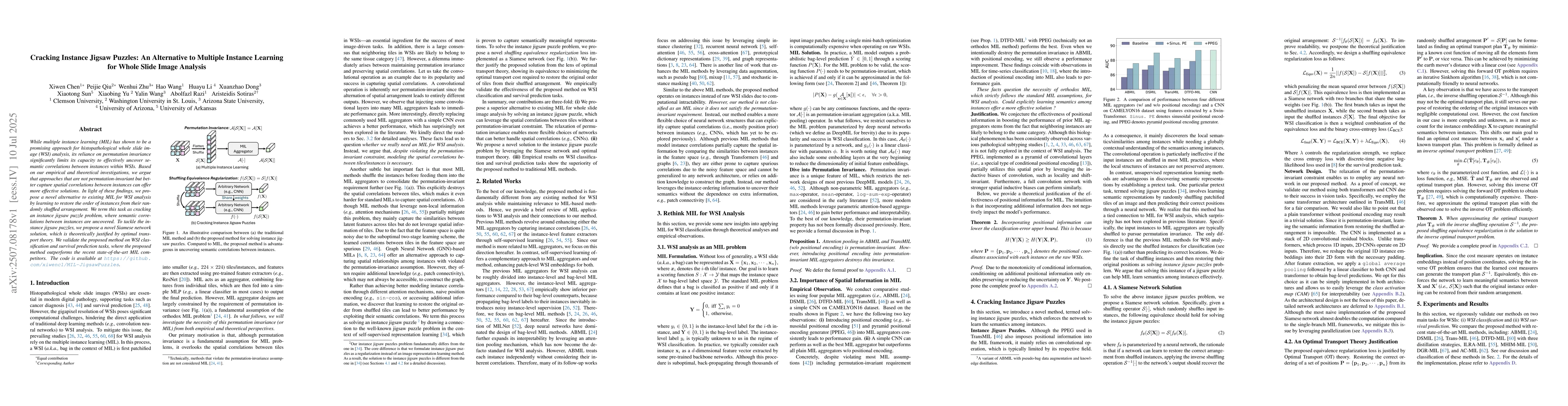 The paper introduces a novel Siamese network solution for 'cracking instance jigsaw puzzles', which is theoretically justified by optimal transport theory, and demonstrates its effectiveness in WSI classification and survival prediction tasks.