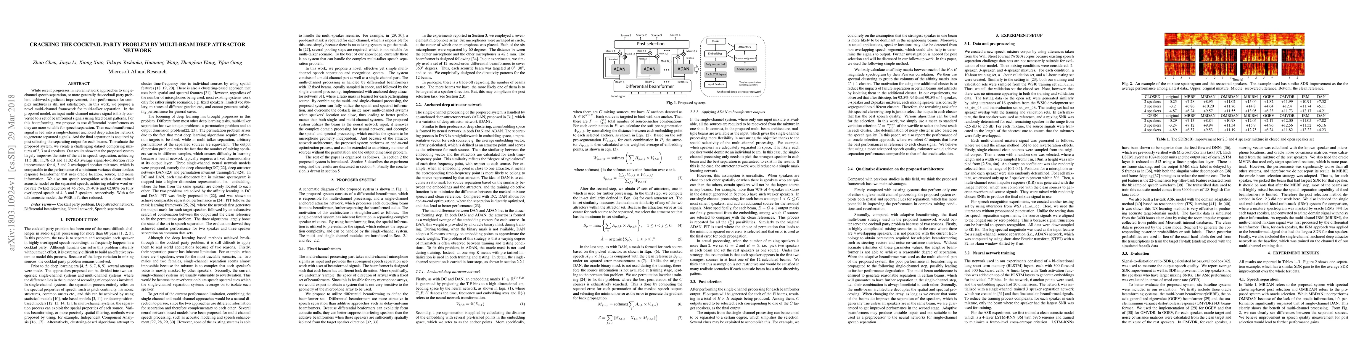 While recent progresses in neural network approaches to single-channel speech separation, or more generally the cocktail party problem, achieved significant improvement, their performance for complex mixtures is still not satisfactory. In this work, we propose a novel multi-channel framework for multi-talker separation. In the proposed model, an input multi-channel mixture signal is firstly converted to a set of beamformed signals using fixed beam patterns. For this beamforming, we propose to use differential beamformers as they are more suitable for speech separation. Then each beamformed signal is fed into a single-channel anchored deep attractor network to generate separated signals. And the final separation is acquired by post selecting the separating output for each beams. To evaluate the proposed system, we create a challenging dataset comprising mixtures of 2, 3 or 4 speakers. Our results show that the proposed system largely improves the state of the art in speech separation, achieving 11.5 dB, 11.76 dB and 11.02 dB average signal-to-distortion ratio improvement for 4, 3 and 2 overlapped speaker mixtures, which is comparable to the performance of a minimum variance distortionless response beamformer that uses oracle location, source, and noise information. We also run speech recognition with a clean trained acoustic model on the separated speech, achieving relative word error rate (WER) reduction of 45.76\%, 59.40\% and 62.80\% on fully overlapped speech of 4, 3 and 2 speakers, respectively. With a far talk acoustic model, the WER is further reduced.