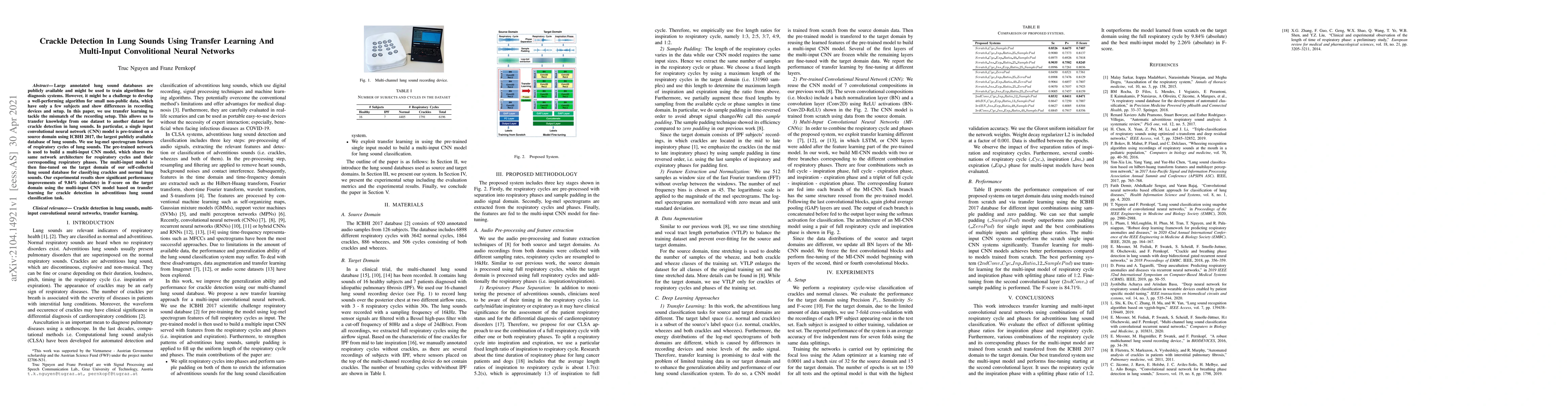 This paper employs transfer learning and multi-input convolutional neural networks (CNNs) to improve crackle detection in lung sounds, addressing the challenge of small, non-public datasets with varying recording setups. The study pre-trains a CNN model on a large public lung sound database and fine-tunes it on a self-collected dataset, achieving a 9.84% improvement in F-score for crackle classification.