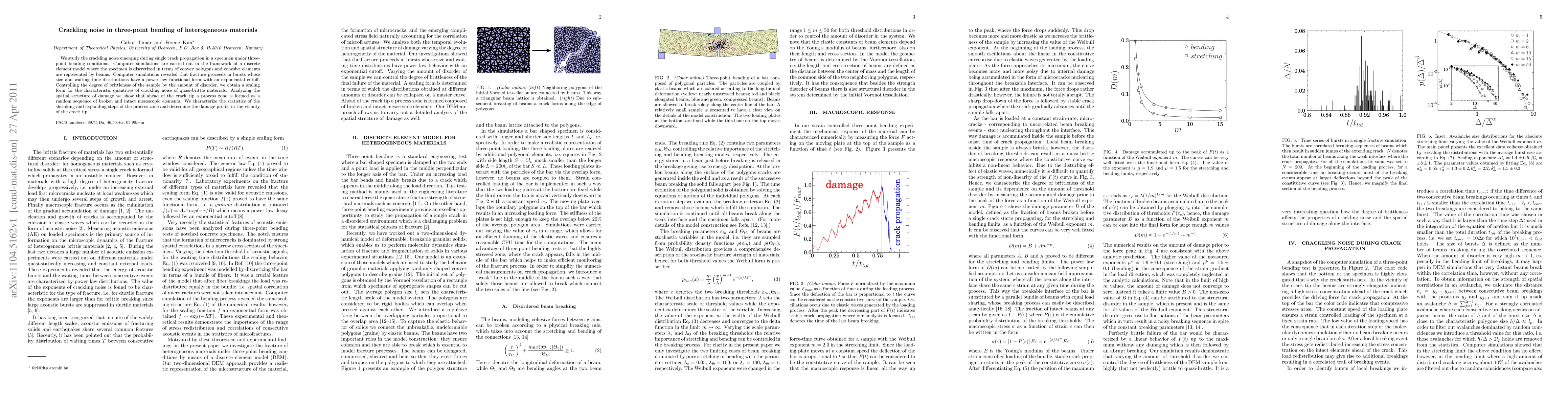 This paper investigates the crackling noise from crack propagation in heterogeneous materials under three-point bending using discrete element simulations. The study reveals that fracture occurs in bursts following a power law distribution, with a scaling form dependent on material brittleness and disorder.