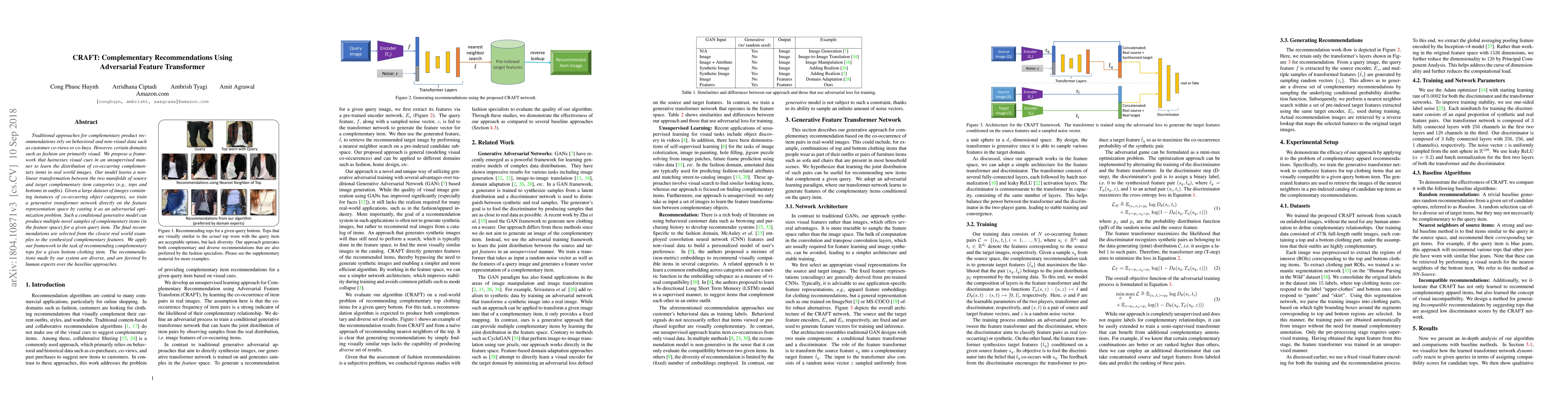 Traditional approaches for complementary product recommendations rely on behavioral and non-visual data such as customer co-views or co-buys. However, certain domains such as fashion are primarily visual. We propose a framework that harnesses visual cues in an unsupervised manner to learn the distribution of co-occurring complementary items in real world images. Our model learns a non-linear transformation between the two manifolds of source and target complementary item categories (e.g., tops and bottoms in outfits). Given a large dataset of images containing instances of co-occurring object categories, we train a generative transformer network directly on the feature representation space by casting it as an adversarial optimization problem. Such a conditional generative model can produce multiple novel samples of complementary items (in the feature space) for a given query item. The final recommendations are selected from the closest real world examples to the synthesized complementary features. We apply our framework to the task of recommending complementary tops for a given bottom clothing item. The recommendations made by our system are diverse, and are favored by human experts over the baseline approaches.