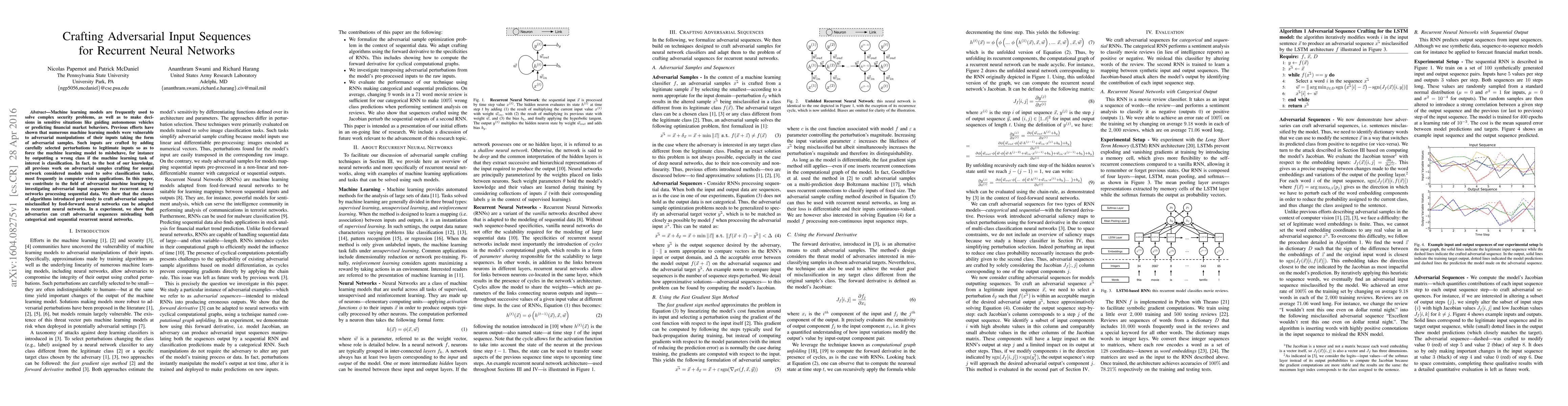 This paper investigates crafting adversarial input sequences for recurrent neural networks, demonstrating that previously developed adversarial sample techniques for feed-forward neural networks can be adapted to mislead recurrent neural networks in both classification and sequential tasks.