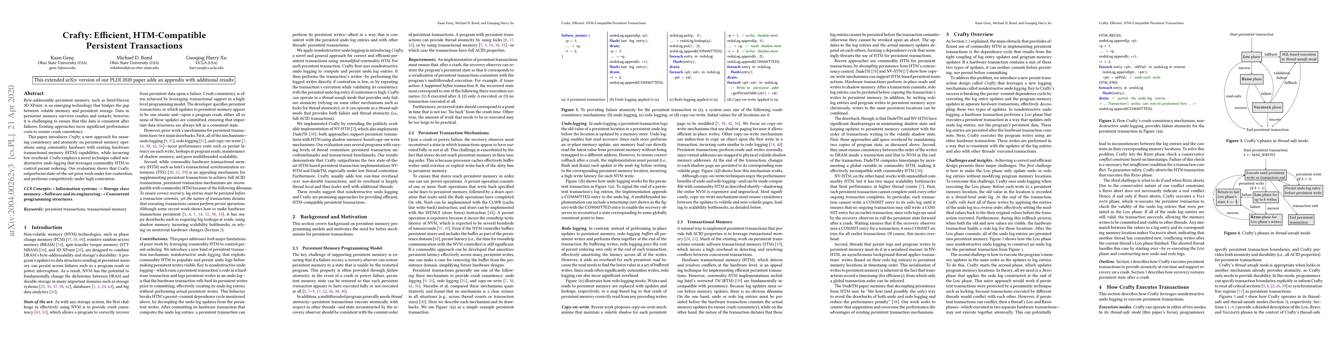 Crafty introduces a low-overhead method for ensuring consistency and atomicity in persistent memory operations using commodity hardware and existing HTM capabilities, employing nondestructive undo logging to manage persist ordering. Evaluations show Crafty outperforms prior methods under low contention and competes well under high contention.
