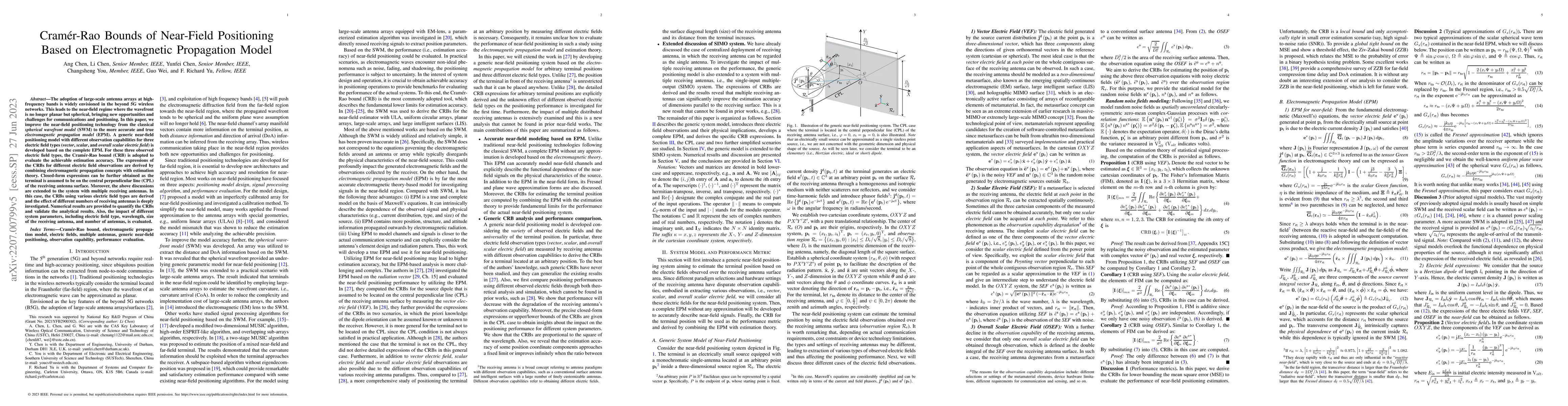 The adoption of large-scale antenna arrays at high-frequency bands is widely envisioned in the beyond 5G wireless networks. This leads to the near-field regime where the wavefront is no longer planar but spherical, bringing new opportunities and challenges for communications and positioning. In this paper, we improve the near-field positioning technology from the classical spherical wavefront model (SWM) to the more accurate and true electromagnetic propagation model (EPM). A generic near-field positioning model with different observation capabilities for three electric field types (vector, scalar, and overall scalar electric field) is developed based on the complete EPM. For these three observed electric field types, the Cram\'er-Rao bound (CRB) is adopted to evaluate the achievable estimation accuracy. The expressions of the CRBs for different electric field observations are derived by combining electromagnetic propagation concepts with estimation theory. Closed-form expressions can be further obtained as the terminal is assumed to be on the central perpendicular line (CPL) of the receiving antenna surface. Moreover, the above discussions are extended to the system with multiple receiving antennas. In this case, the CRBs using various electric field types are derived, and the effect of different numbers of receiving antennas is deeply investigated. Numerical results are provided to quantify the CRBs and validate the analytical results. Also, the impact of different system parameters, including electric field type, wavelength, size of the receiving antenna, and number of antennas, is evaluated.