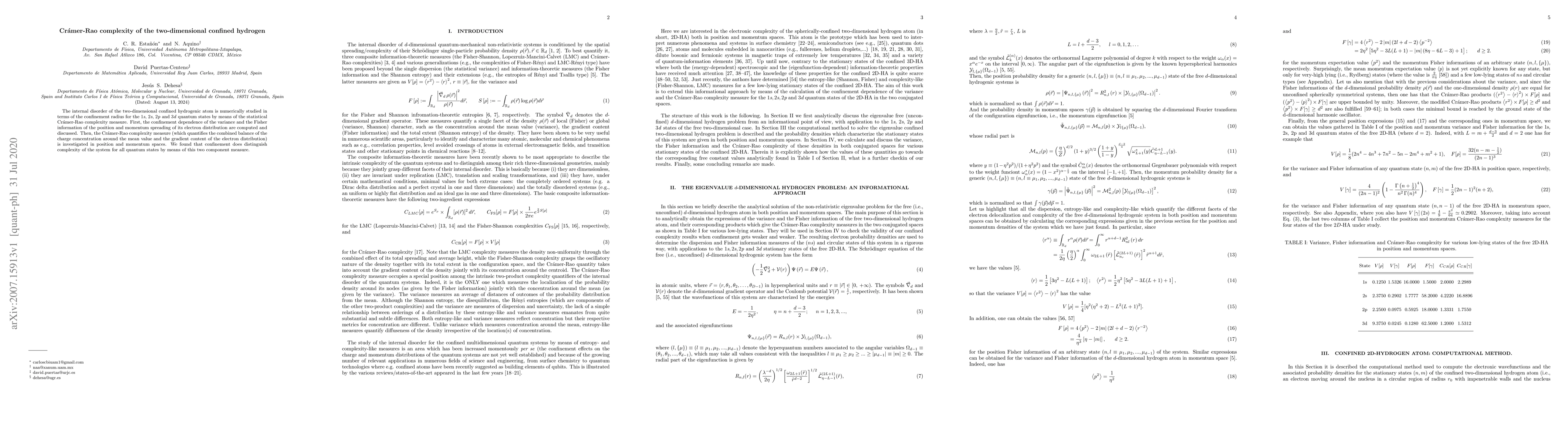 This paper numerically investigates the internal disorder of two-dimensional confined hydrogenic atoms across various quantum states using the Cramer-Rao complexity measure. It finds that confinement radius significantly affects the complexity, balancing charge concentration and gradient content in both position and momentum spaces.