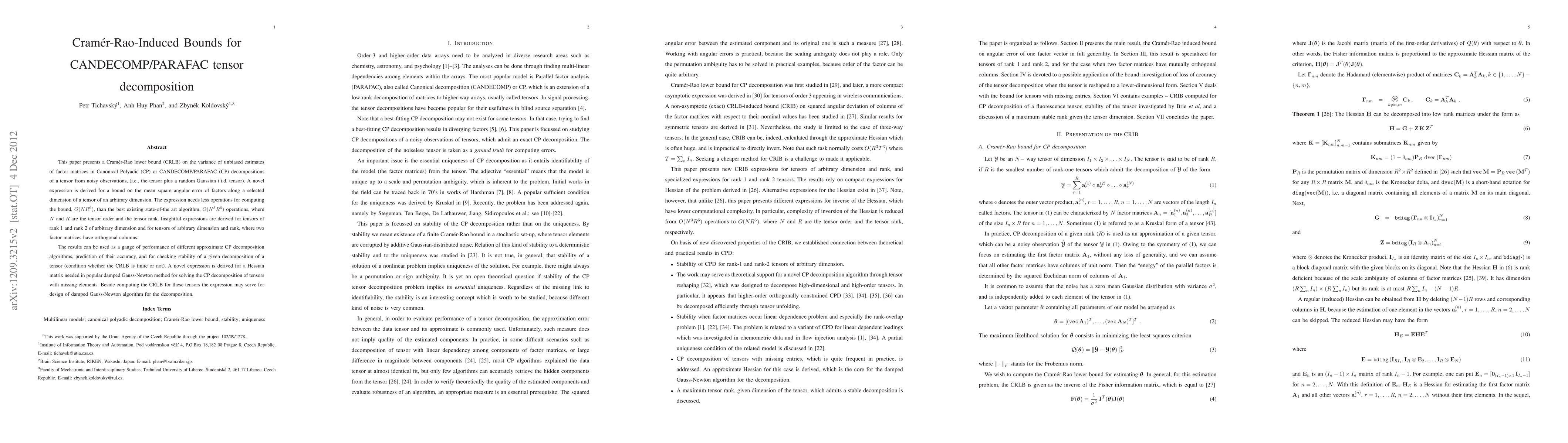 This paper presents a Cramer-Rao lower bound (CRLB) on the variance of unbiased estimates of factor matrices in Canonical Polyadic (CP) or CANDECOMP/PARAFAC (CP) decompositions of a tensor from noisy observations, (i.e., the tensor plus a random Gaussian i.i.d. tensor). A novel expression is derived for a bound on the mean square angular error of factors along a selected dimension of a tensor of an arbitrary dimension. The expression needs less operations for computing the bound, O(NR^6), than the best existing state-of-the art algorithm, O(N^3R^6) operations, where N and R are the tensor order and the tensor rank. Insightful expressions are derived for tensors of rank 1 and rank 2 of arbitrary dimension and for tensors of arbitrary dimension and rank, where two factor matrices have orthogonal columns. The results can be used as a gauge of performance of different approximate CP decomposition algorithms, prediction of their accuracy, and for checking stability of a given decomposition of a tensor (condition whether the CRLB is finite or not). A novel expression is derived for a Hessian matrix needed in popular damped Gauss-Newton method for solving the CP decomposition of tensors with missing elements. Beside computing the CRLB for these tensors the expression may serve for design of damped Gauss-Newton algorithm for the decomposition.
