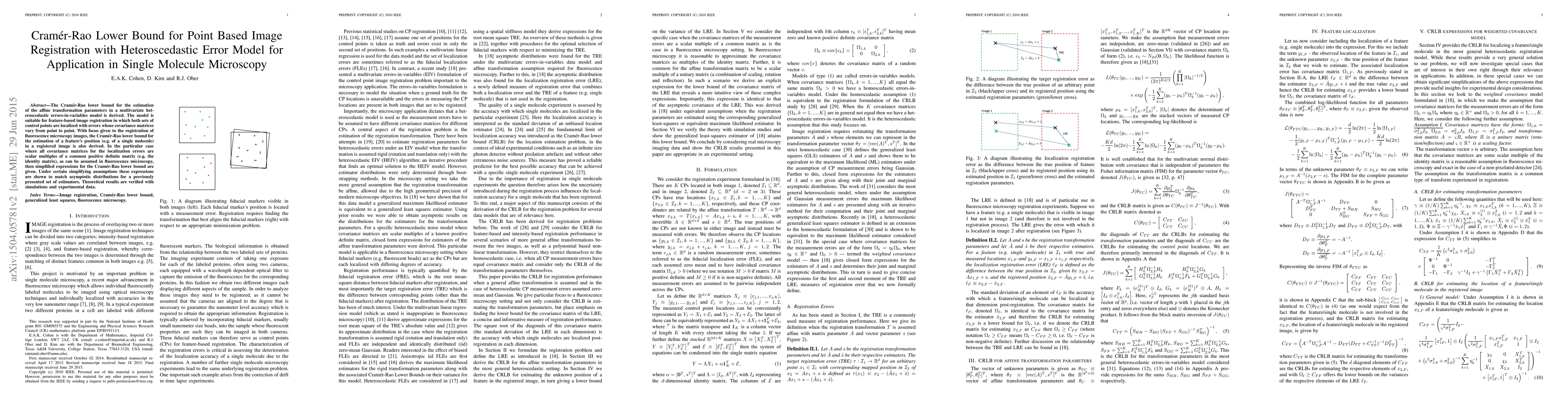 This paper derives the Cramer-Rao lower bound for estimating affine transformation parameters in a heteroscedastic errors-in-variables model for point-based image registration, particularly for single molecule microscopy. It also provides simplified expressions for the bound under common fluorescence microscopy assumptions and validates the results using simulations and experimental data.