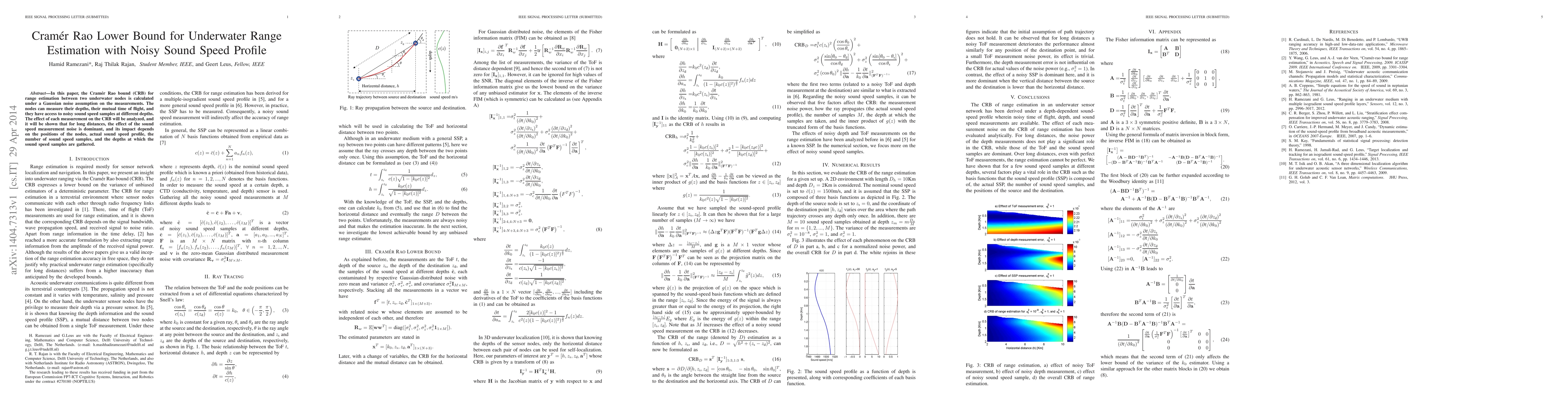 This paper calculates the Cramer Rao bound (CRB) for underwater range estimation under Gaussian noise, analyzing the impact of various measurement types. It finds that sound speed measurement noise significantly affects range estimation accuracy, especially over long distances, depending on node positions, sound speed profiles, and sampling depths.