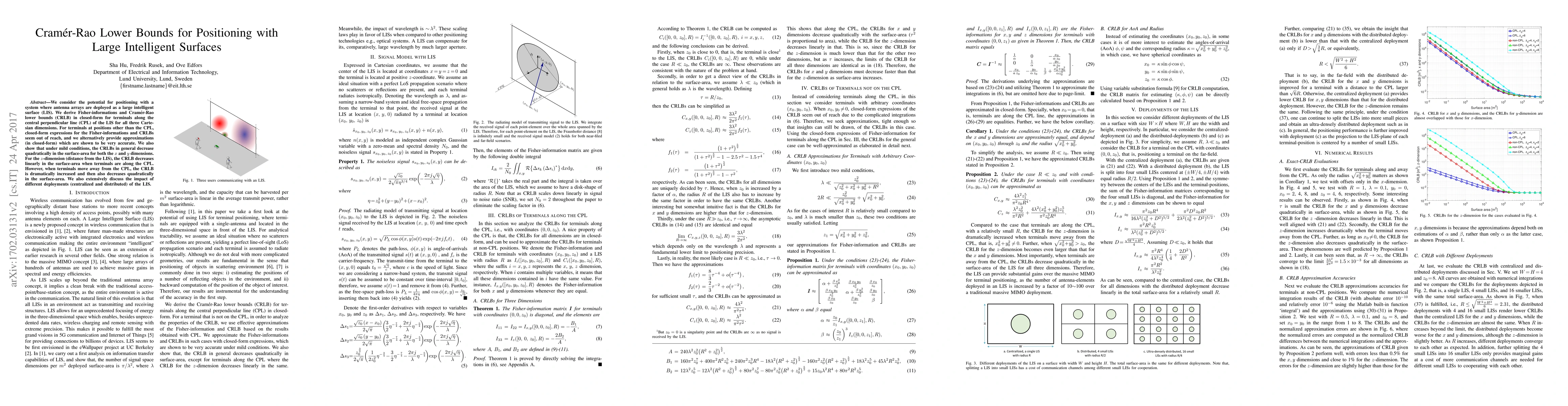 Researchers derive closed-form Cramér-Rao lower bounds for positioning with large intelligent surfaces, showing that the bounds decrease quadratically in surface area for some dimensions and linearly for others.