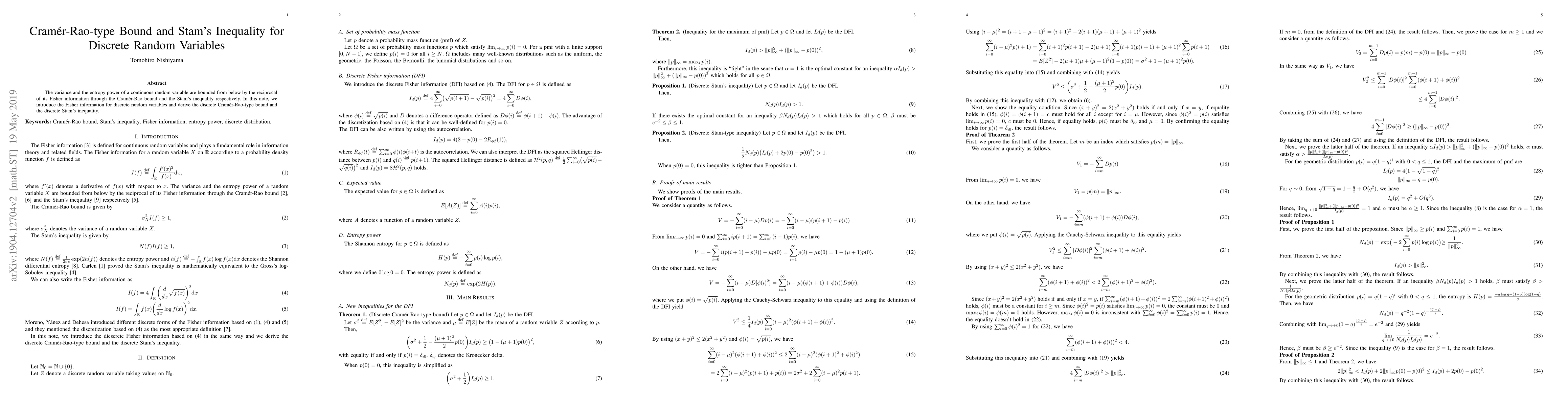 This paper introduces Fisher information for discrete random variables and derives the discrete Cramér-Rao-type bound and the discrete Stam's inequality, extending the bounds from continuous to discrete contexts.