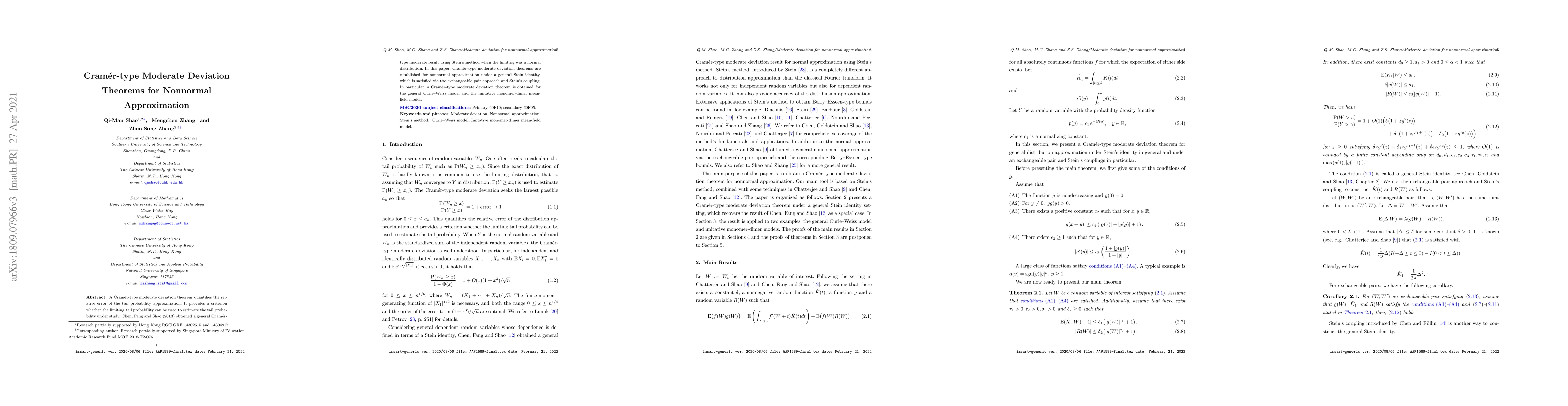 This paper establishes Cram\'er-type moderate deviation theorems for nonnormal approximations using a general Stein identity, extending previous results for normal distributions. It applies the exchangeable pair approach and Stein's coupling, and provides specific results for the Curie--Weiss model and the imitative monomer-dimer mean-field model.