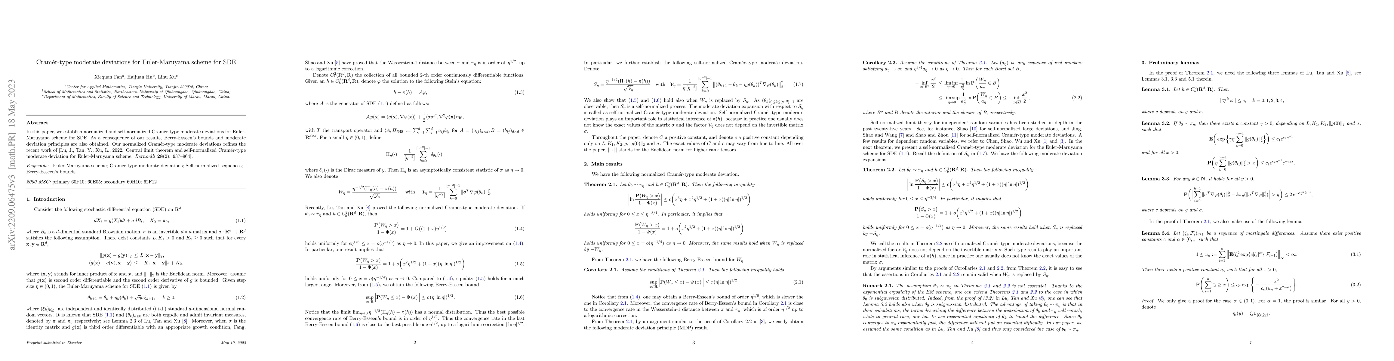 In this paper, we establish normalized and self-normalized Cram\'er-type moderate deviations for Euler-Maruyama scheme for SDE. As a consequence of our results, Berry-Esseen's bounds and moderate deviation principles are also obtained. Our normalized Cram\'er-type moderate deviations refines the recent work of [Lu, J., Tan, Y., Xu, L., 2022. Central limit theorem and self-normalized Cram\'er-type moderate deviation for Euler-Maruyama scheme. Bernoulli 28(2): 937--964].