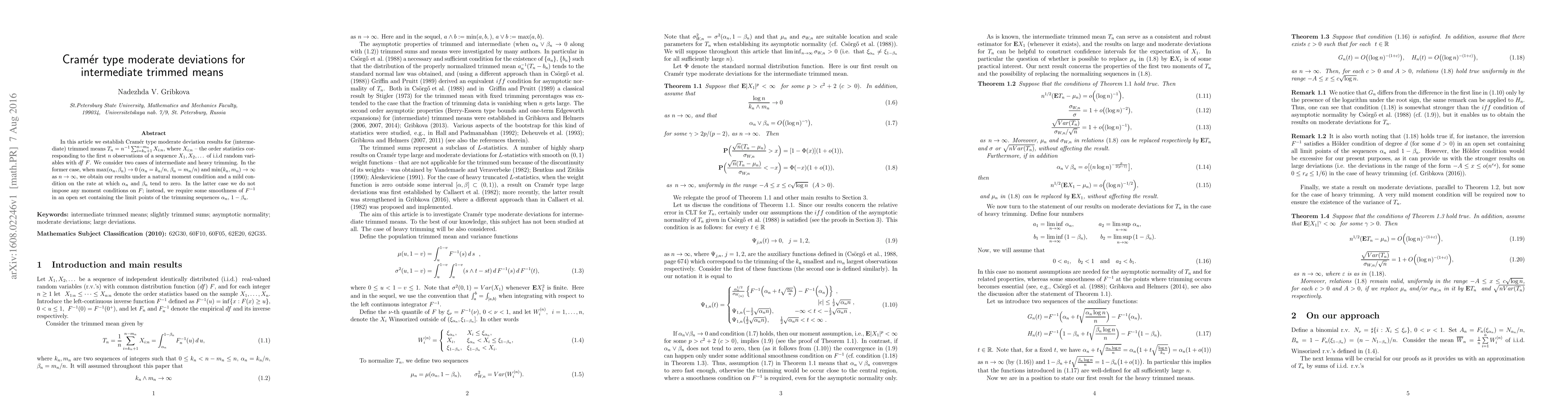 In this article we establish Cram\'er type moderate deviation results for (intermediate) trimmed means $T_n=n^{-1} \sum_{i=k_n+1}^{n-m_n}X_{i:n}$, where $X_{i:n}$ -- the order statistics corresponding to the first $n$ observations of a~sequence $X_1,X_2,\dots $ of i.i.d random variables with $df$ $F$. We consider two cases of intermediate and heavy trimming. In the former case, when $\max(\alpha_n,\beta_n)\to 0$ ($\alpha_n=k_n/n$, $\beta_n=m_n/n$) and $\min(k_n,m_n)\to\infty$ as $n\to\infty$, we obtain our results under a~natural moment condition and a~mild condition on the rate at which $\alpha_n$ and $\beta_n$ tend to zero. In the latter case we do not impose any moment conditions on $F$, instead, we require some smoothness of $F^{-1}$ in an~open set containing the limit points of the trimming sequences $\alpha_n$, $1-\beta_n$.