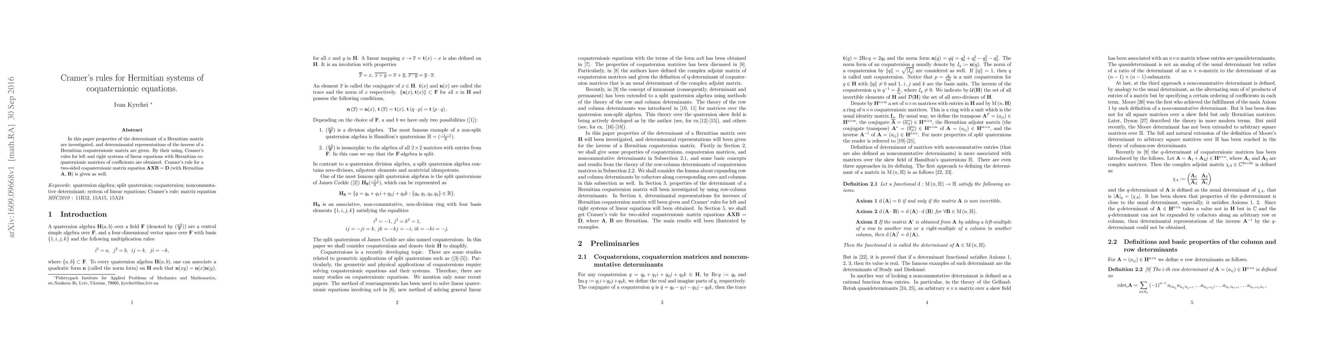 In this paper properties of the determinant of a Hermitian matrix are investigated, and determinantal representations of the inverse of a Hermitian coquaternionic matrix are given. By their using, Cramer's rules for left and right systems of linear equations with Hermitian coquaternionic matrices of coefficients are obtained. Cramer's rule for a two-sided coquaternionic matrix equation ${\bf AXB}={\bf D}$ (with Hermitian ${\bf A}$, ${\bf B}$) is given as well.