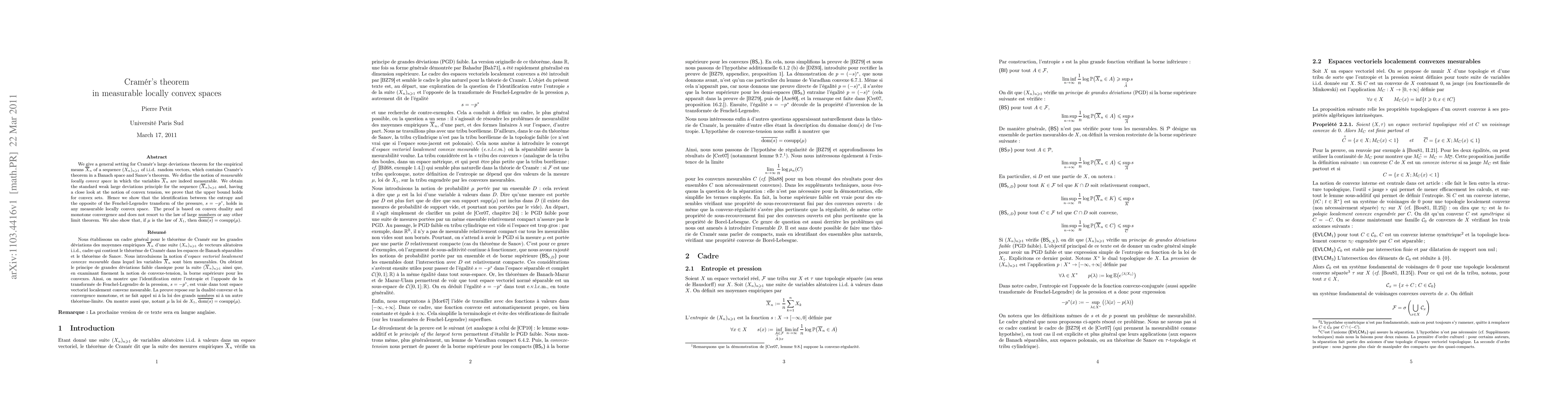 This paper presents a generalized framework for Cramér's large deviations theorem applicable to measurable locally convex spaces, encompassing both Cramér's theorem in separable Banach spaces and Sanov's theorem for empirical means of i.i.d. random vectors.