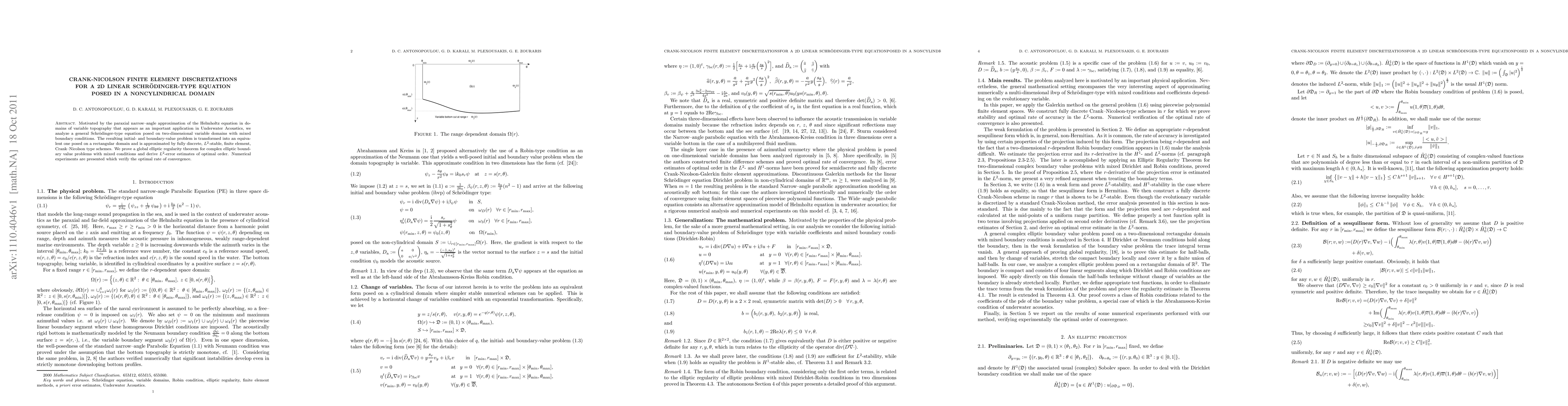 This paper develops Crank-Nicolson finite element methods for solving a 2D Schrödinger-type equation in noncylindrical domains, motivated by underwater acoustics applications. It proves an elliptic regularity theorem and derives optimal $L^2$-error estimates, validated by numerical experiments.