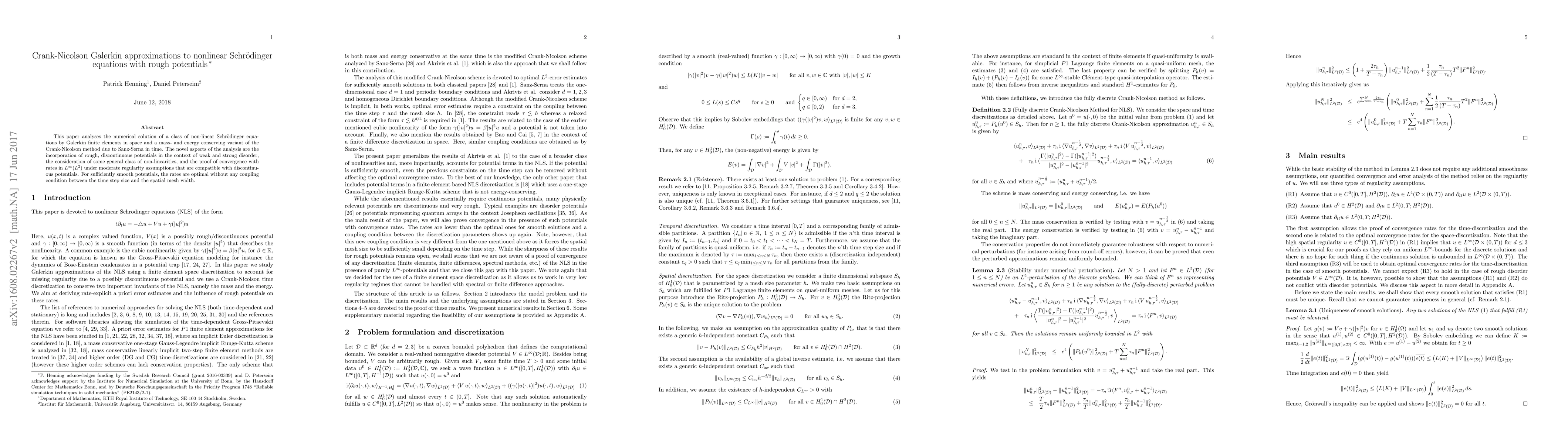 This paper analyses the numerical solution of a class of non-linear Schr\"odinger equations by Galerkin finite elements in space and a mass- and energy conserving variant of the Crank-Nicolson method due to Sanz-Serna in time. The novel aspects of the analysis are the incorporation of rough, discontinuous potentials in the context of weak and strong disorder, the consideration of some general class of non-linearities, and the proof of convergence with rates in $L^{\infty}(L^2)$ under moderate regularity assumptions that are compatible with discontinuous potentials. For sufficiently smooth potentials, the rates are optimal without any coupling condition between the time step size and the spatial mesh width.