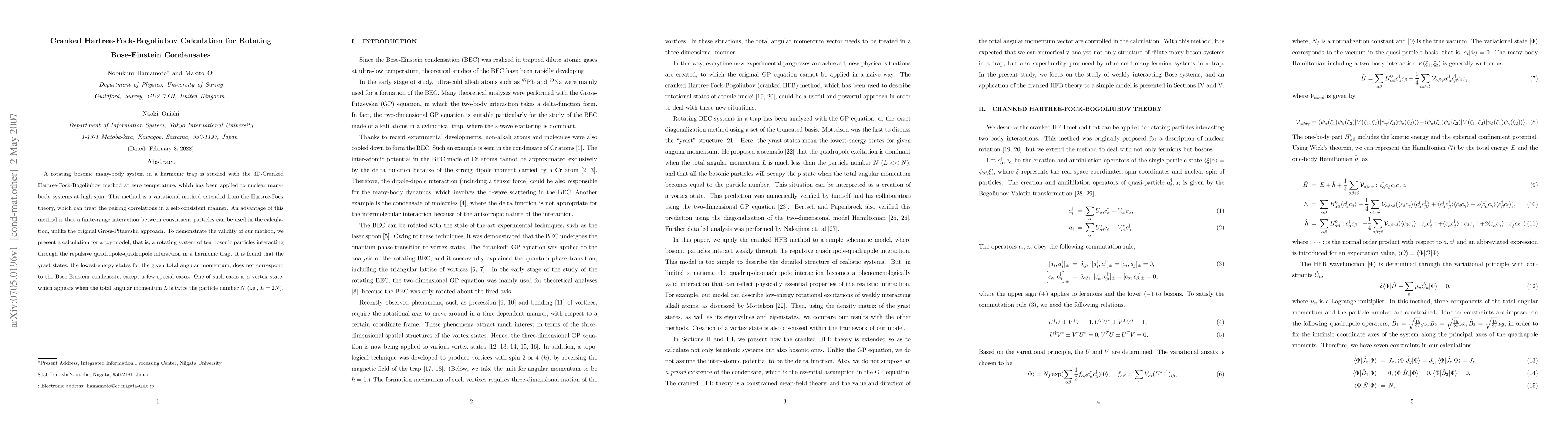 This paper applies the 3D-Cranked Hartree-Fock-Bogoliubov method to study rotating bosonic systems in a harmonic trap, demonstrating its effectiveness through a ten-boson model with repulsive quadrupole-quadrupole interactions. The method reveals that yrast states do not always correspond to the Bose-Einstein condensate, except in special cases like the vortex state when angular momentum is twice the particle number.