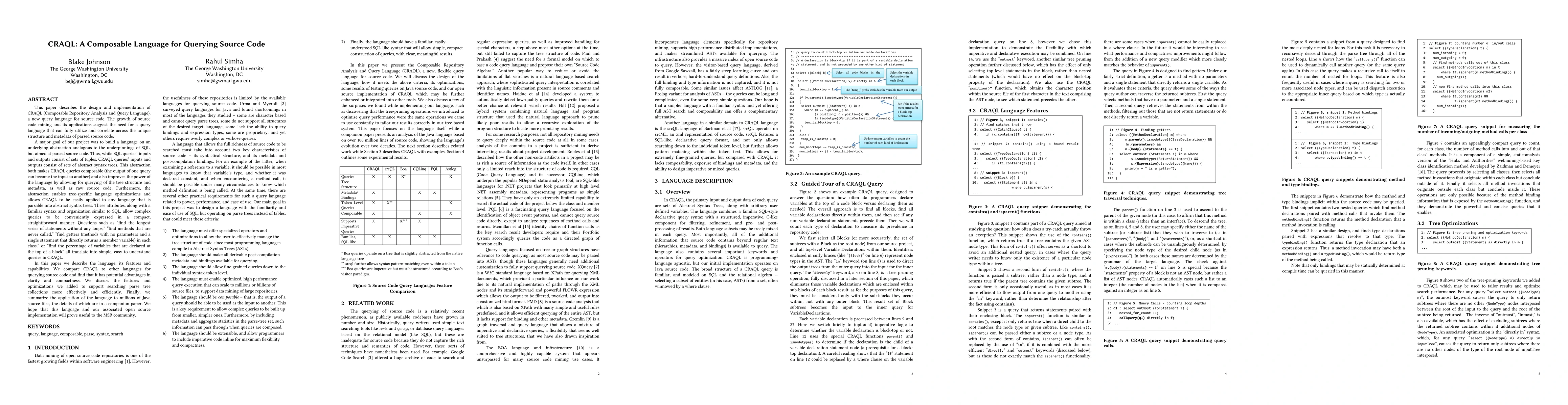 CRAQL is a new composable query language designed for analyzing and querying parsed source code, utilizing abstract syntax trees (ASTs) for powerful, structured queries. It offers a SQL-like syntax for efficient and clear querying of source code metadata and structure, with potential advantages over other source code querying languages.