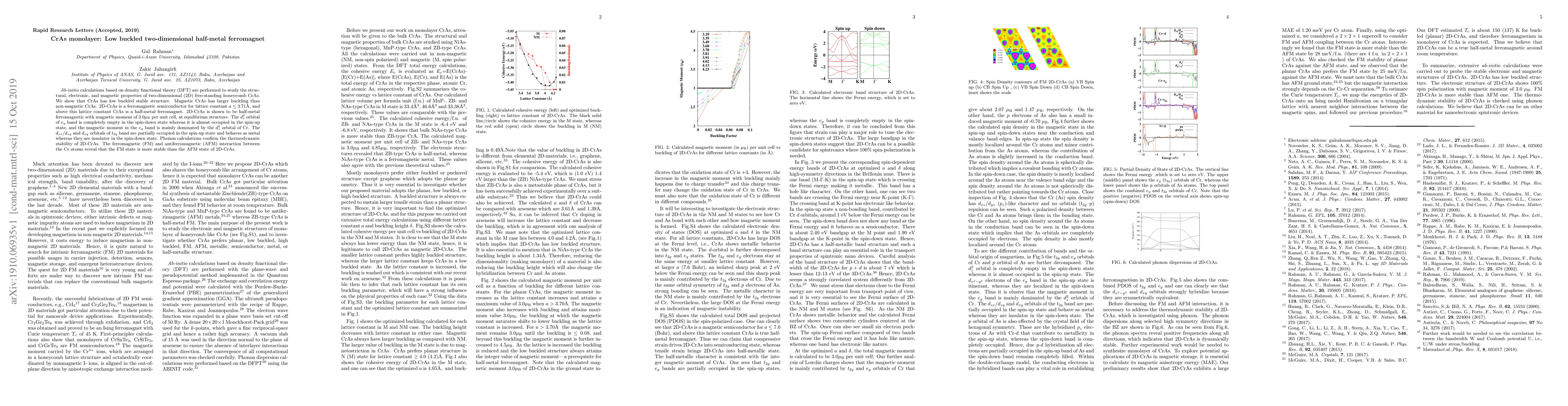 This paper reports that monolayer CrAs exhibits low buckled structure and is a ferromagnetic semiconductor with a transition to half-metal ferromagnet above a lattice constant of 3.71 Å, dominated by the $d_{z}^{2}$ orbital of Cr. Phonon calculations confirm its thermodynamic stability, and the FM state is more stable than the AFM state.