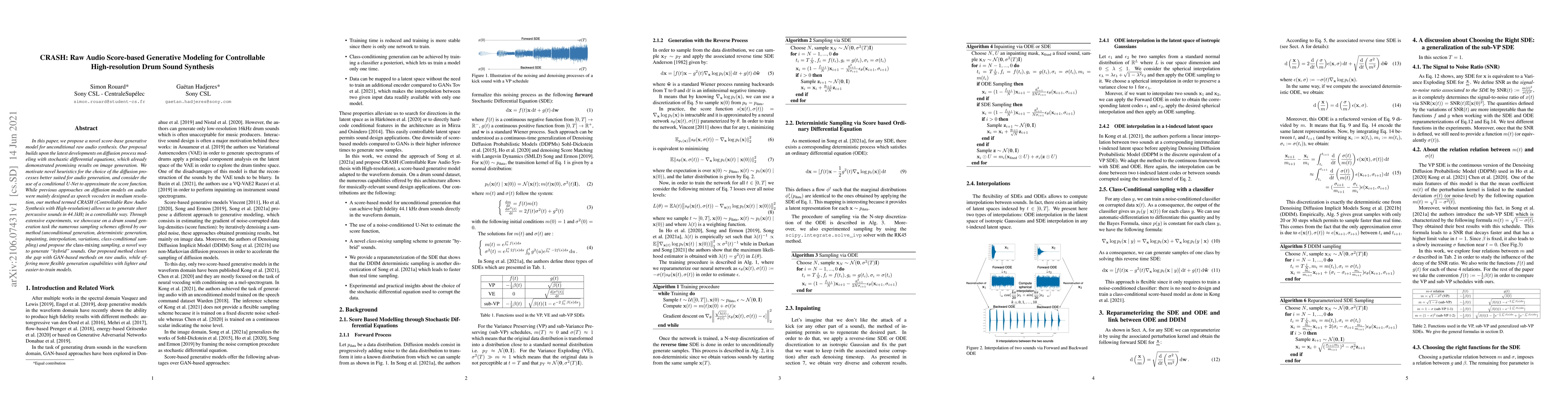 The paper introduces CRASH, a novel score-based generative model for high-resolution drum sound synthesis using diffusion processes. This method, offering various sampling schemes, outperforms GAN-based methods with more flexible and easier-to-train models.