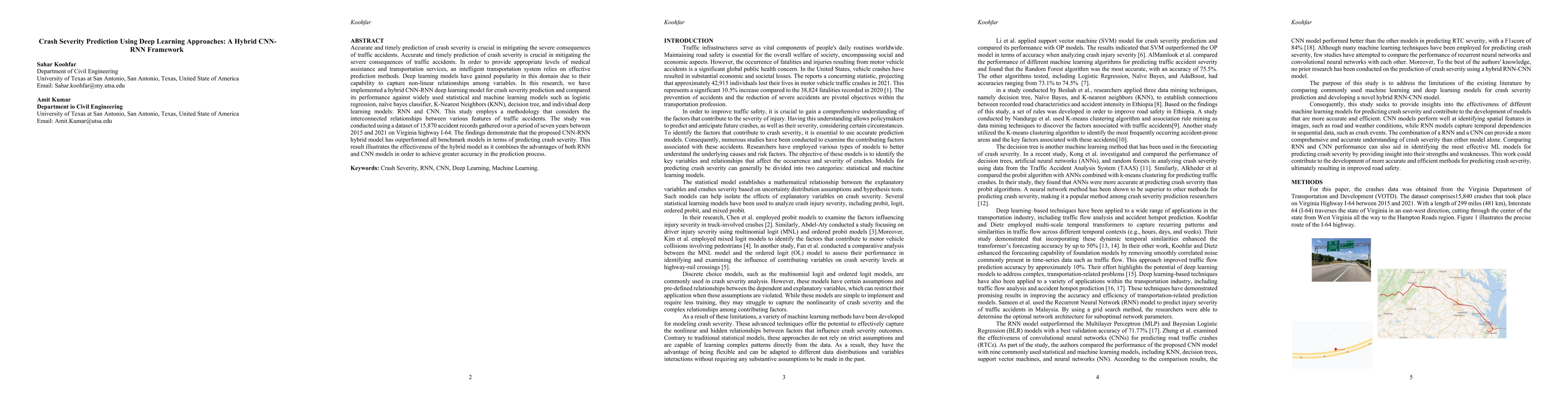 This research highlights the potential of deep learning in enhancing traffic safety by accurately predicting crash severity, aiding in timely medical and transportation interventions. The findings support the use of hybrid models for complex pattern recognition in accident data.