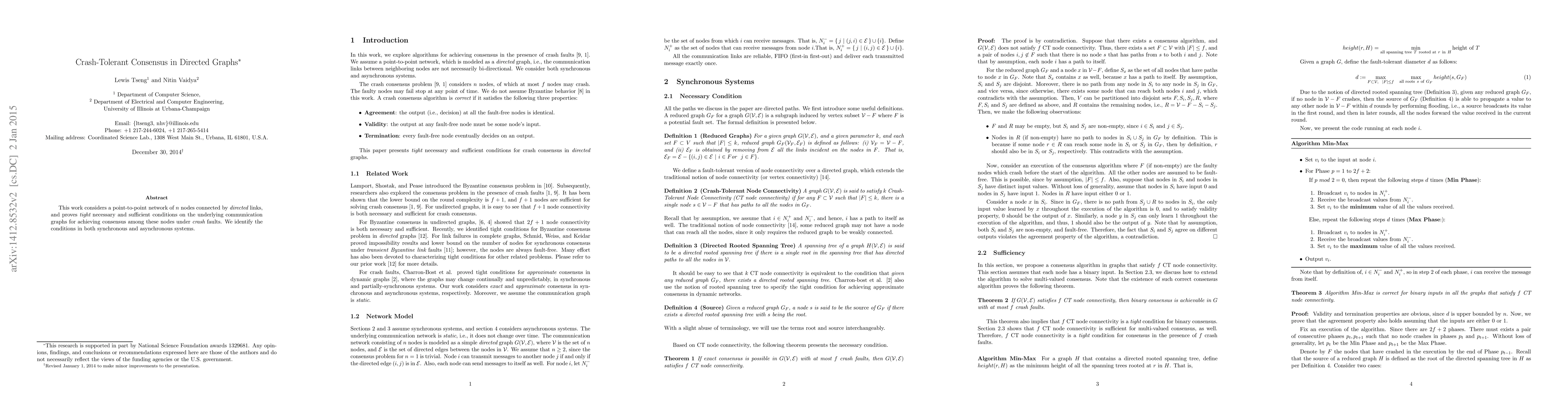 This paper establishes necessary and sufficient conditions for consensus in directed graphs under crash faults, applicable to both synchronous and asynchronous systems, ensuring fault tolerance in networked nodes.