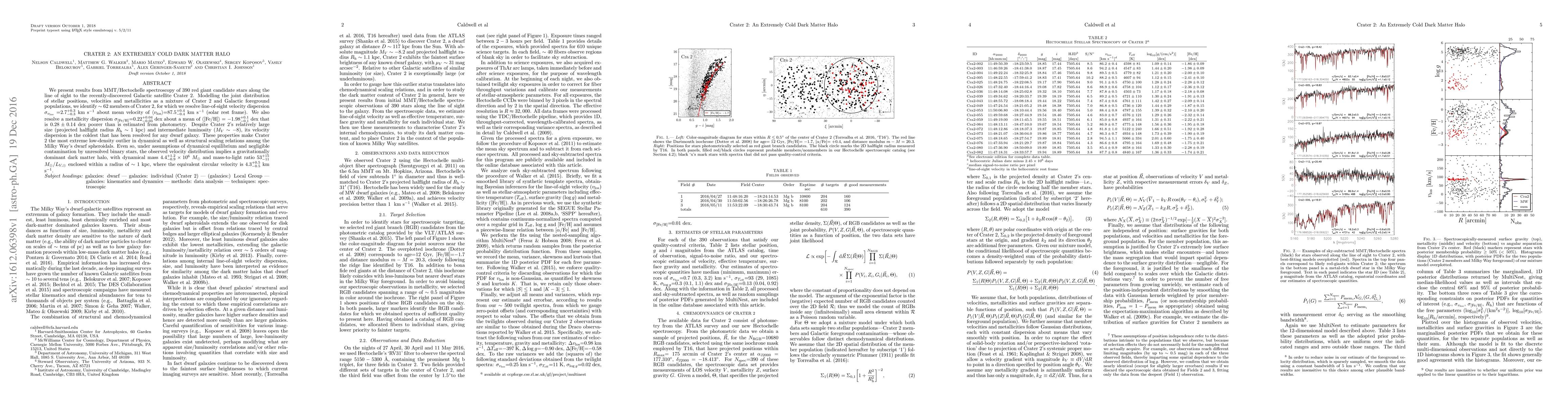 We present results from MMT/Hectochelle spectroscopy of red giant candidate stars along the line of sight to the recently-discovered Galactic satellite Crater 2. Modelling the joint distribution of stellar positions, velocities and metallicities as a mixture of Crater 2 and Galactic foreground populations, we identify 62 members of Crater 2, for which we resolve line-of-sight velocity dispersion 2.7 +/- 0.3 km/s about mean velocity of 87.5 +/- 0.4 km/s. We also resolve a metallicity dispersion 0.22 about a mean of [Fe/H]=-1.98 +/- 0.1 that is 0.28 +/- 0.14 poorer than is estimated from photometry. Despite Crater 2's relatively large size (projected halflight radius R(h)=1 kpc) and intermediate luminosity (M_V =-8), its velocity dispersion is the coldest that has been resolved for any dwarf galaxy. These properties make Crater 2 the most extreme low-density outlier in dynamical as well as structural scaling relations among the Milky Way's dwarf spheroidals. Even so, under assumptions of dynamical equilibrium and negligible contamination by unresolved binary stars, the observed velocity distribution implies a gravitationally dominant dark matter halo, with dynamical mass 4.4 x 10^6 Msun and mass-to-light ratio M/L=53 enclosed within a radius of 1 kpc, where the equivalent circular velocity is 4.3 km/s.