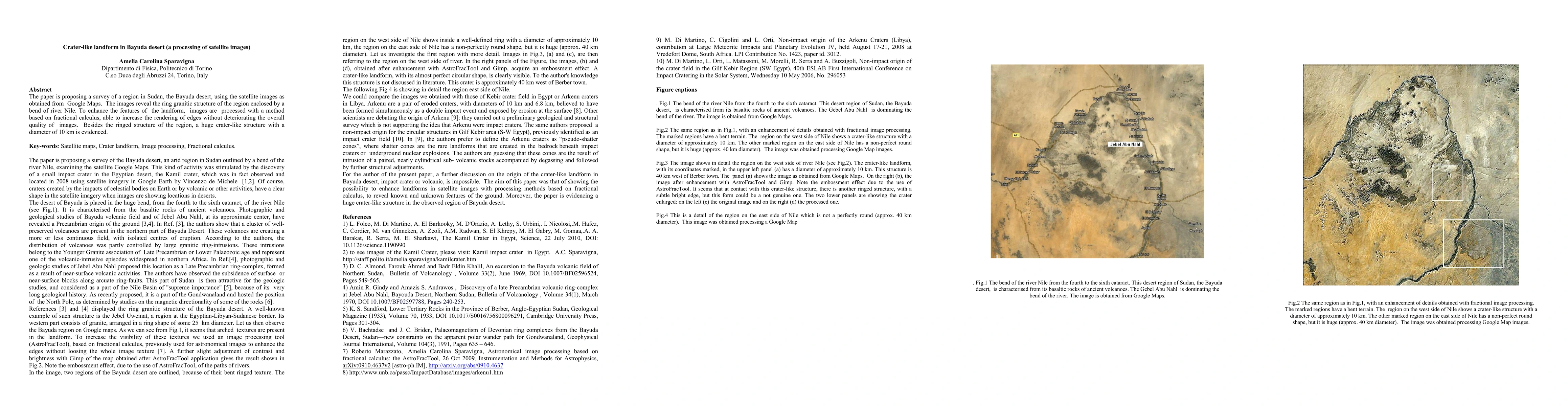 The paper is proposing a survey of a region in Sudan, the Bayuda desert, using the satellite images as obtained from Google Maps. The images reveal the ring granitic structure of the region enclosed by a bend of river Nile. To enhance the features of the landform, images are processed with a method based on fractional calculus, able to increase the rendering of edges without deteriorating the overall quality of images. Besides the ringed structure of the region, a huge crater-like structure with a diameter of 10 km is evidenced.