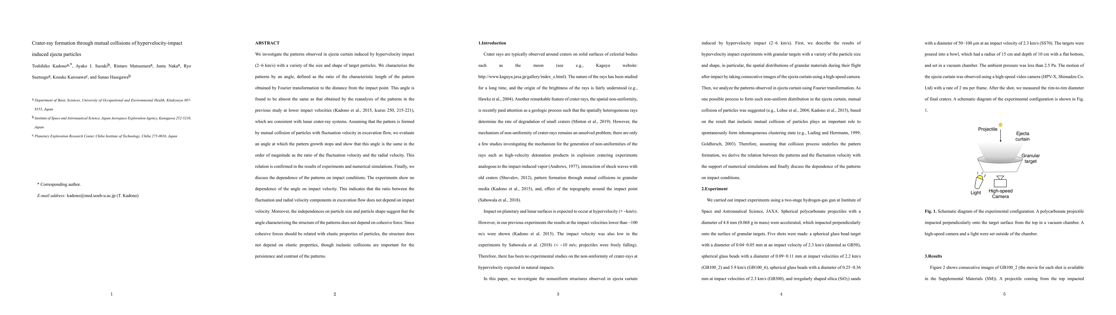 We investigate the patterns observed in ejecta curtain induced by hypervelocity impact (2-6 km/s) with a variety of the size and shape of target particles. We characterize the patterns by an angle, defined as the ratio of the characteristic length of the pattern obtained by Fourier transformation to the distance from the impact point. This angle is found to be almost the same as that obtained by the reanalysis of the patterns in the previous study at lower impact velocities (Kadono et al., 2015, Icarus 250, 215-221), which are consistent with lunar crater-ray systems. Assuming that the pattern is formed by mutual collision of particles with fluctuation velocity in excavation flow, we evaluate an angle at which the pattern growth stops and show that this angle is the same in the order of magnitude as the ratio of the fluctuation velocity and the radial velocity. This relation is confirmed in the results of experiments and numerical simulations. Finally, we discuss the dependence of the patterns on impact conditions. The experiments show no dependence of the angle on impact velocity. This indicates that the ratio between the fluctuation and radial velocity components in excavation flow does not depend on impact velocity. Moreover, the independences on particle size and particle shape suggest that the angle characterizing the structure of the patterns does not depend on cohesive force. Since cohesive forces should be related with elastic properties of particles, the structure does not depend on elastic properties, though inelastic collisions are important for the persistence and contrast of the patterns.