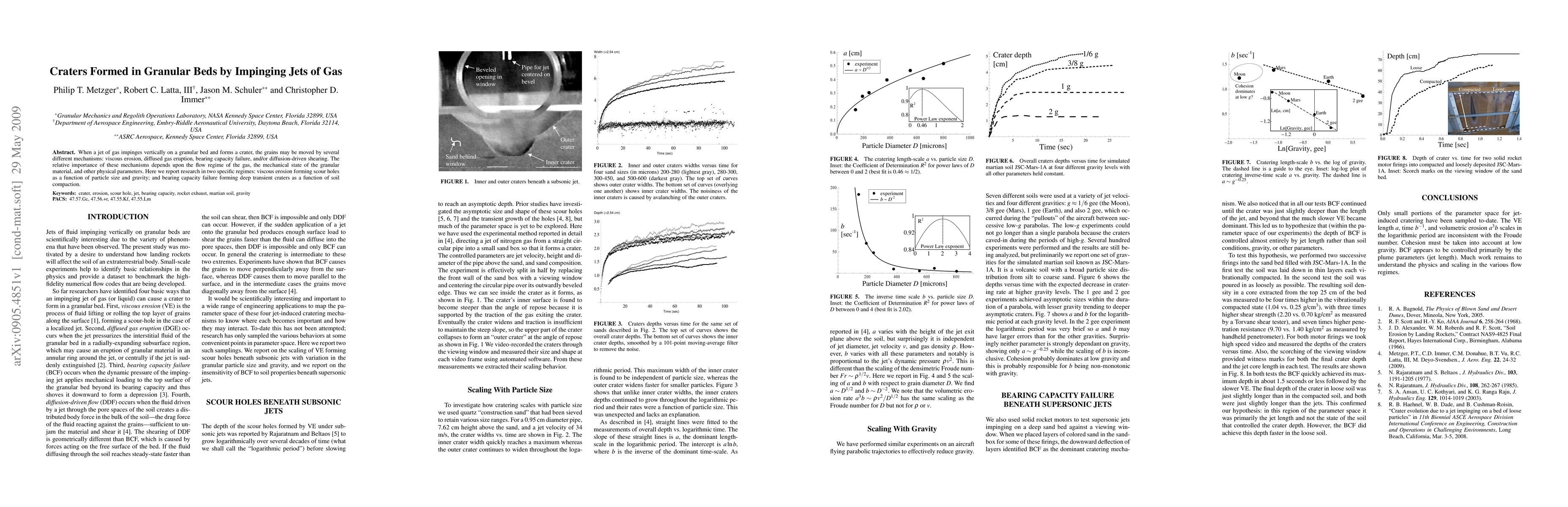 When a jet of gas impinges vertically on a granular bed and forms a crater, the grains may be moved by several different mechanisms: viscous erosion, diffused gas eruption, bearing capacity failure, and/or diffusion-driven shearing. The relative importance of these mechanisms depends upon the flow regime of the gas, the mechanical state of the granular material, and other physical parameters. Here we report research in two specific regimes: viscous erosion forming scour holes as a function of particle size and gravity; and bearing capacity failure forming deep transient craters as a function of soil compaction.