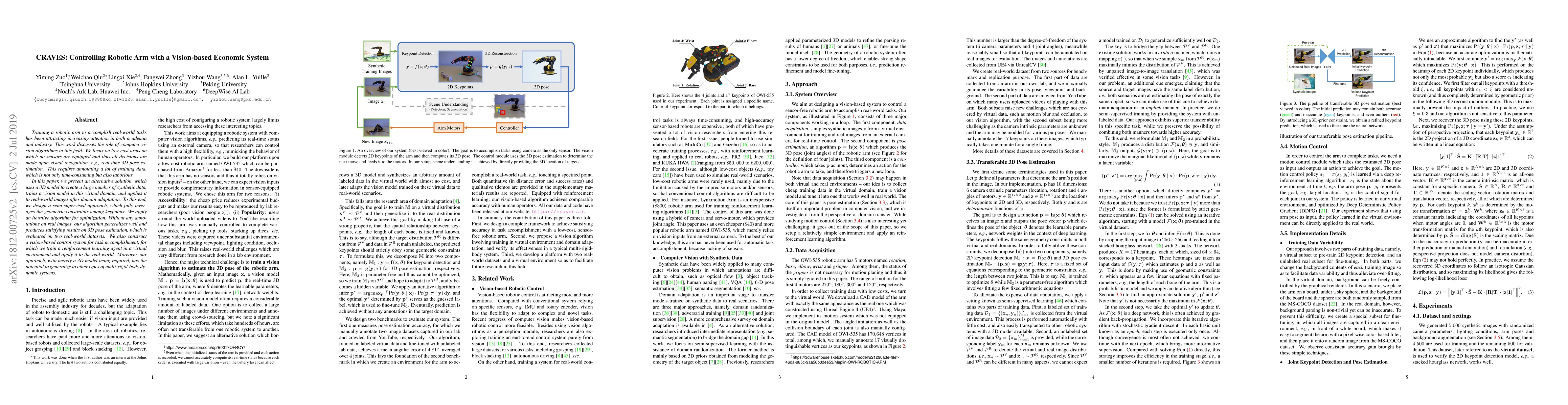 Training a robotic arm to accomplish real-world tasks has been attracting increasing attention in both academia and industry. This work discusses the role of computer vision algorithms in this field. We focus on low-cost arms on which no sensors are equipped and thus all decisions are made upon visual recognition, e.g., real-time 3D pose estimation. This requires annotating a lot of training data, which is not only time-consuming but also laborious. In this paper, we present an alternative solution, which uses a 3D model to create a large number of synthetic data, trains a vision model in this virtual domain, and applies it to real-world images after domain adaptation. To this end, we design a semi-supervised approach, which fully leverages the geometric constraints among keypoints. We apply an iterative algorithm for optimization. Without any annotations on real images, our algorithm generalizes well and produces satisfying results on 3D pose estimation, which is evaluated on two real-world datasets. We also construct a vision-based control system for task accomplishment, for which we train a reinforcement learning agent in a virtual environment and apply it to the real-world. Moreover, our approach, with merely a 3D model being required, has the potential to generalize to other types of multi-rigid-body dynamic systems.