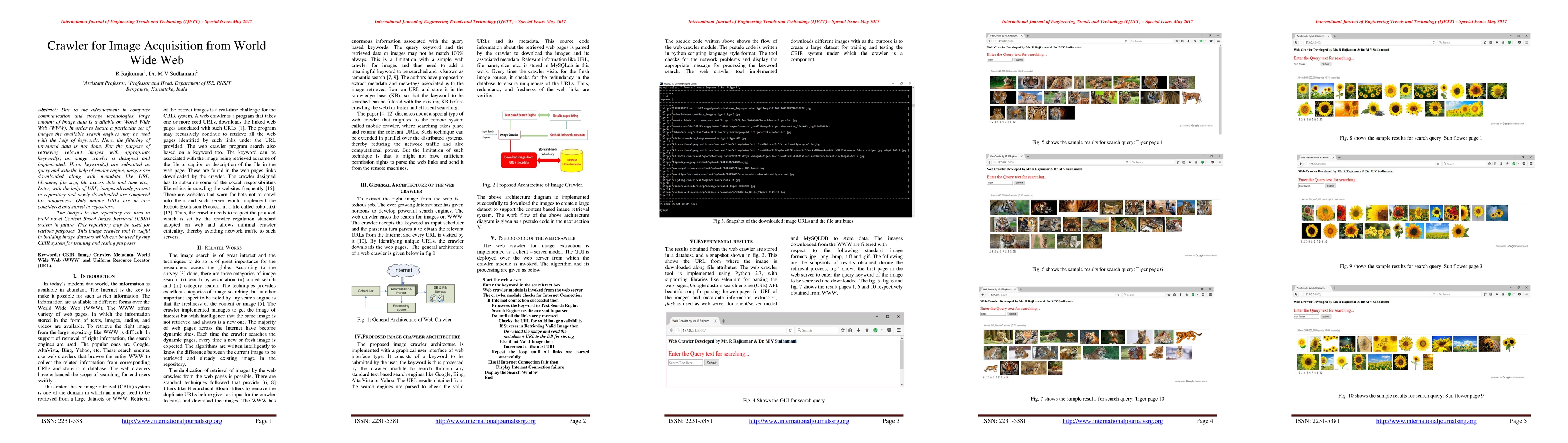 Due to the advancement in computer communication and storage technologies, large amount of image data is available on World Wide Web (WWW). In order to locate a particular set of images the available search engines may be used with the help of keywords. Here, the filtering of unwanted data is not done. For the purpose of retrieving relevant images with appropriate keyword(s) an image crawler is designed and implemented. Here, keyword(s) are submitted as query and with the help of sender engine, images are downloaded along with metadata like URL, filename, file size, file access date and time etc.,. Later, with the help of URL, images already present in repository and newly downloaded are compared for uniqueness. Only unique URLs are in turn considered and stored in repository. The images in the repository are used to build novel Content Based Image Retrieval (CBIR) system in future. This repository may be used for various purposes. This image crawler tool is useful in building image datasets which can be used by any CBIR system for training and testing purposes.